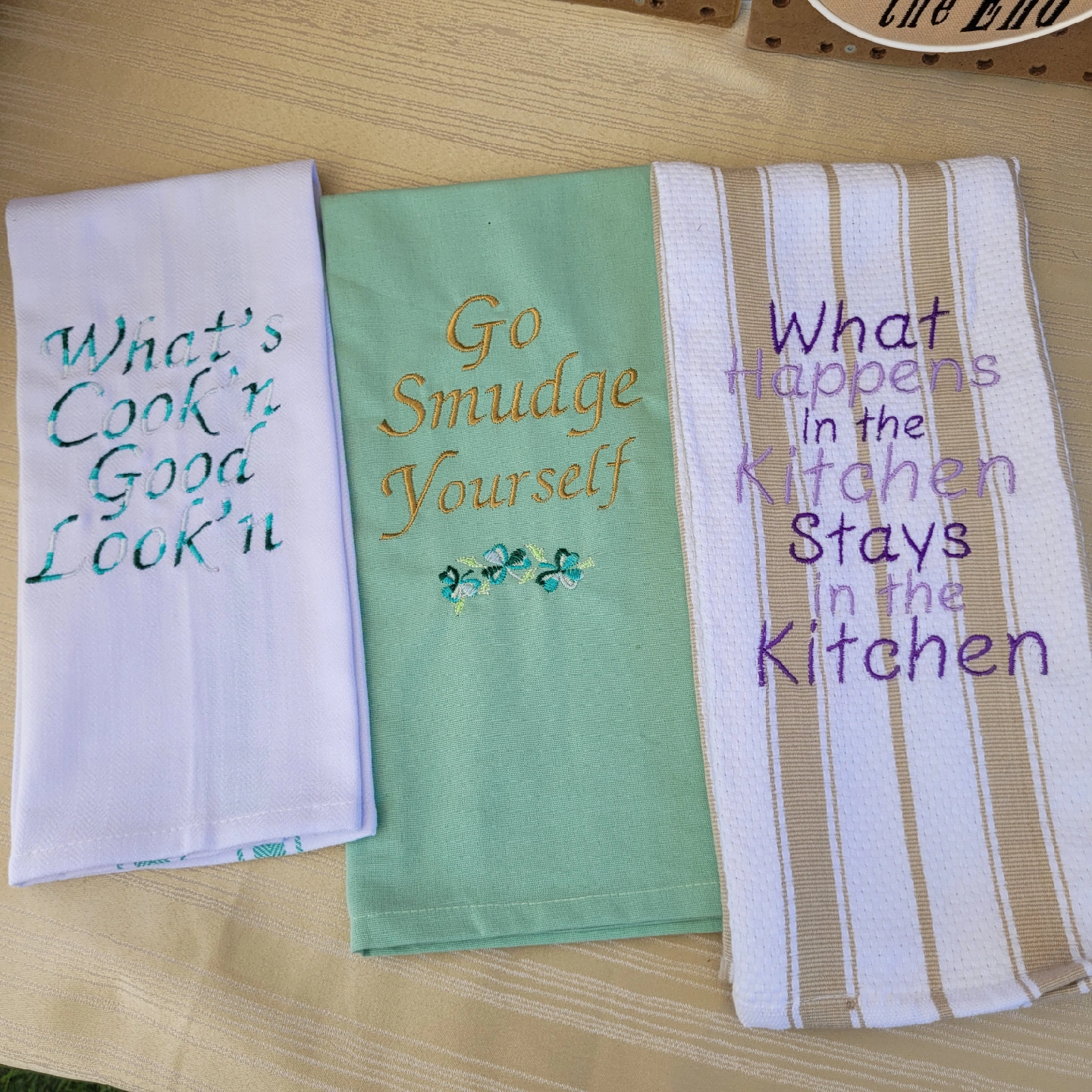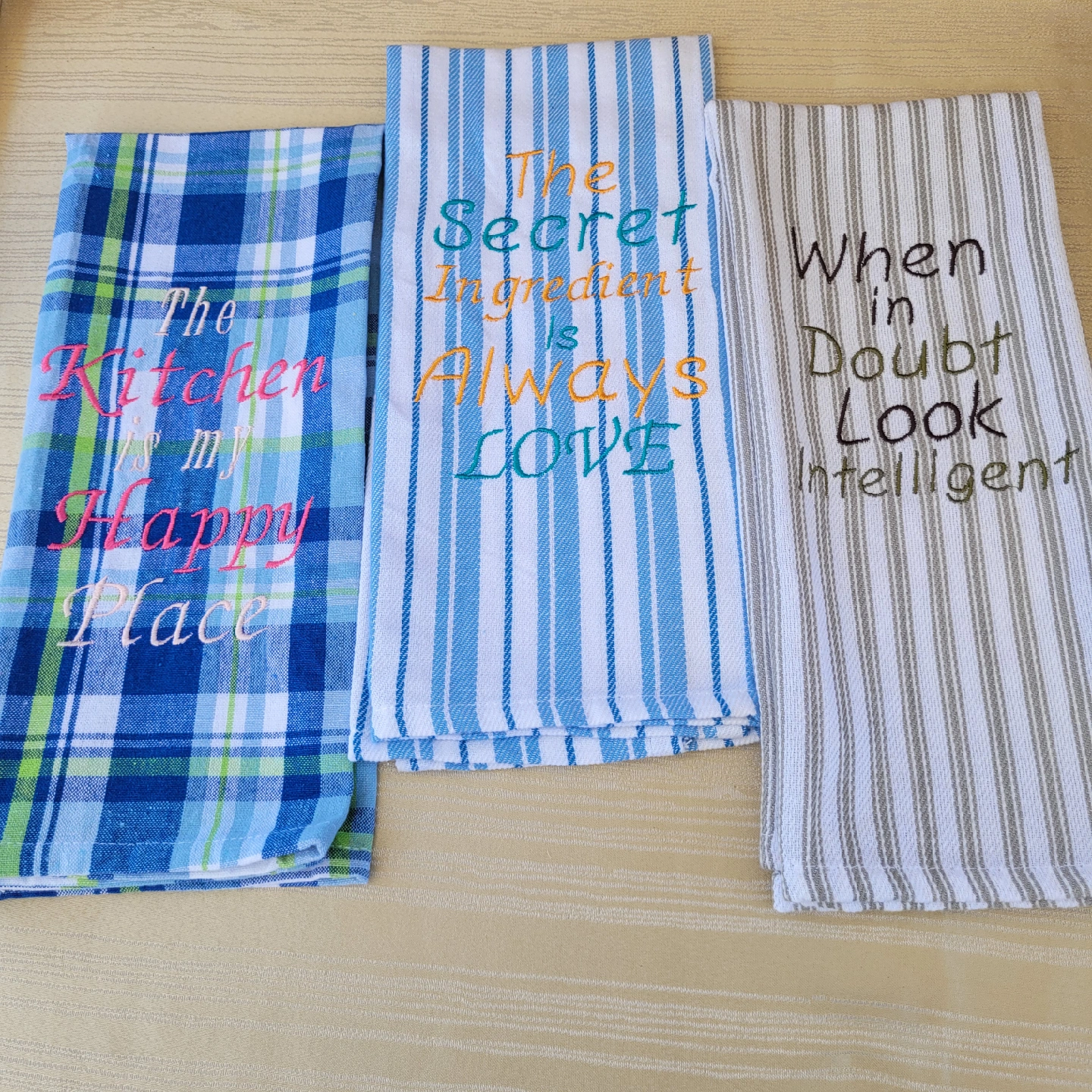 Perfect Gift Machine Embroidered by Me SilvaMarie 100% Cotton Tea Towels - Please See all pictures 8.00 or 2 for 15.00 May be able to Costomize for depending on what you would like! Please See all my Other Listings, Bundle & Save for a Better Deal! Located in Bradford, May be able to Meet, Shipping Offered at Buyers Expense, Please contact me for more Info & to make arrangements, sorry no holds without an ET, Thank you so much for Looking!