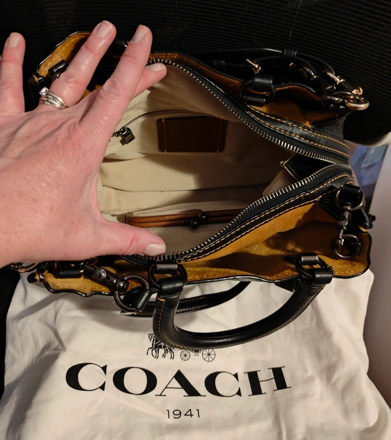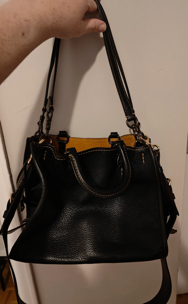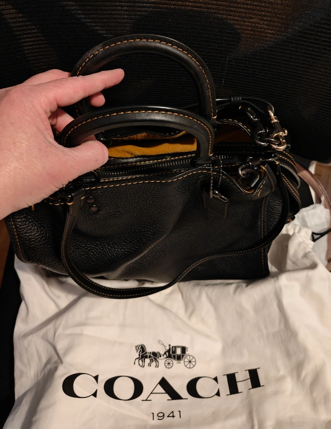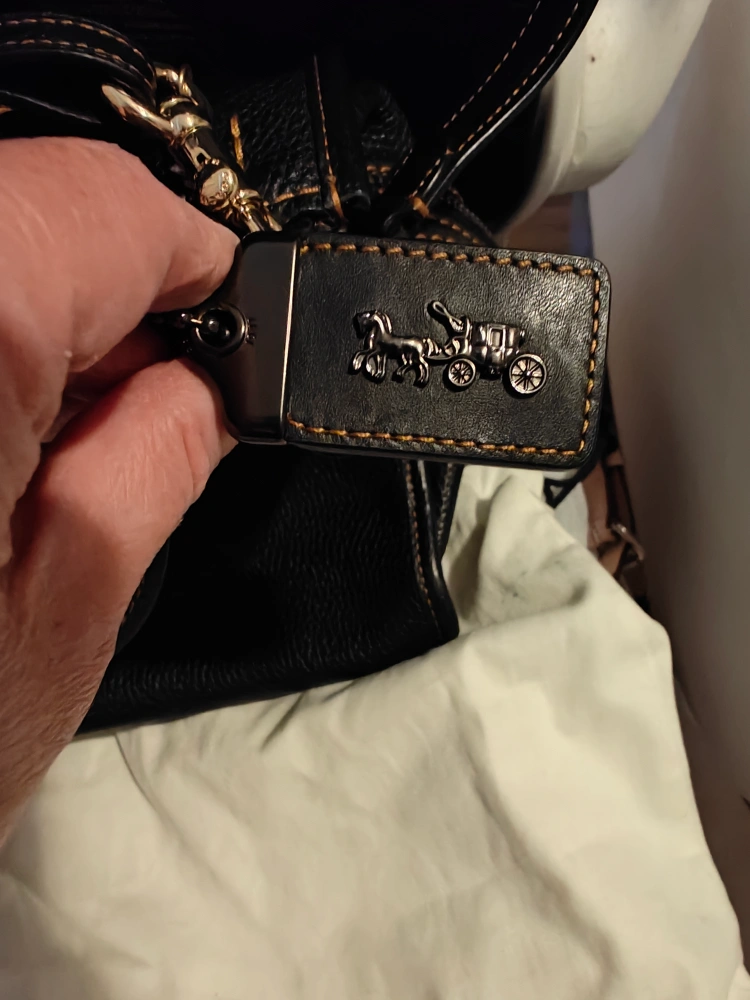 Selling a Coach black leather satchel. It's in great condition and comes with its original dust bag. The bag features a classic design with a horse and carriage logo on the tag and dust bag. It's perfect for everyday use or a night out. I am asking a bit more as I purchased the thick leather crossbody strap separately.
