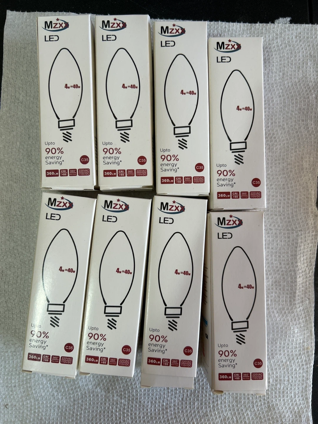 I have several brand new MZX LED light bulbs for sale! These are C35 bulbs, 4W=40W, and offer up to 90% energy savings. They operate at 220VAC/110VDC and have a CRI greater than 80. Each bulb emits 360 lumens. Perfect for energy-efficient lighting!