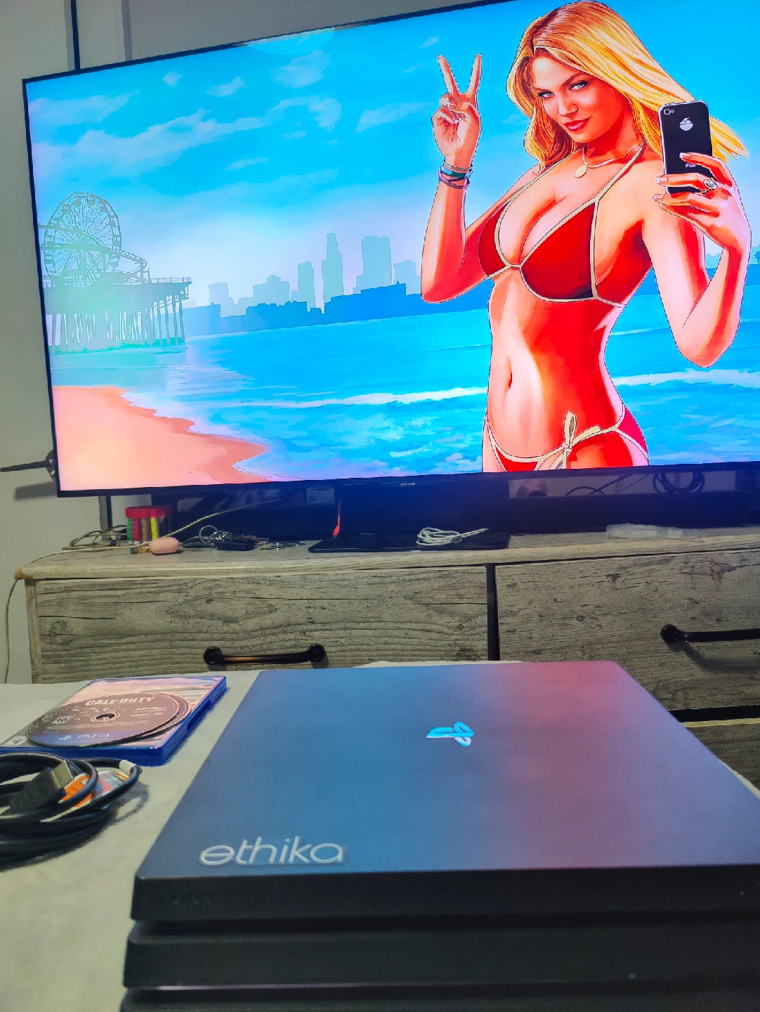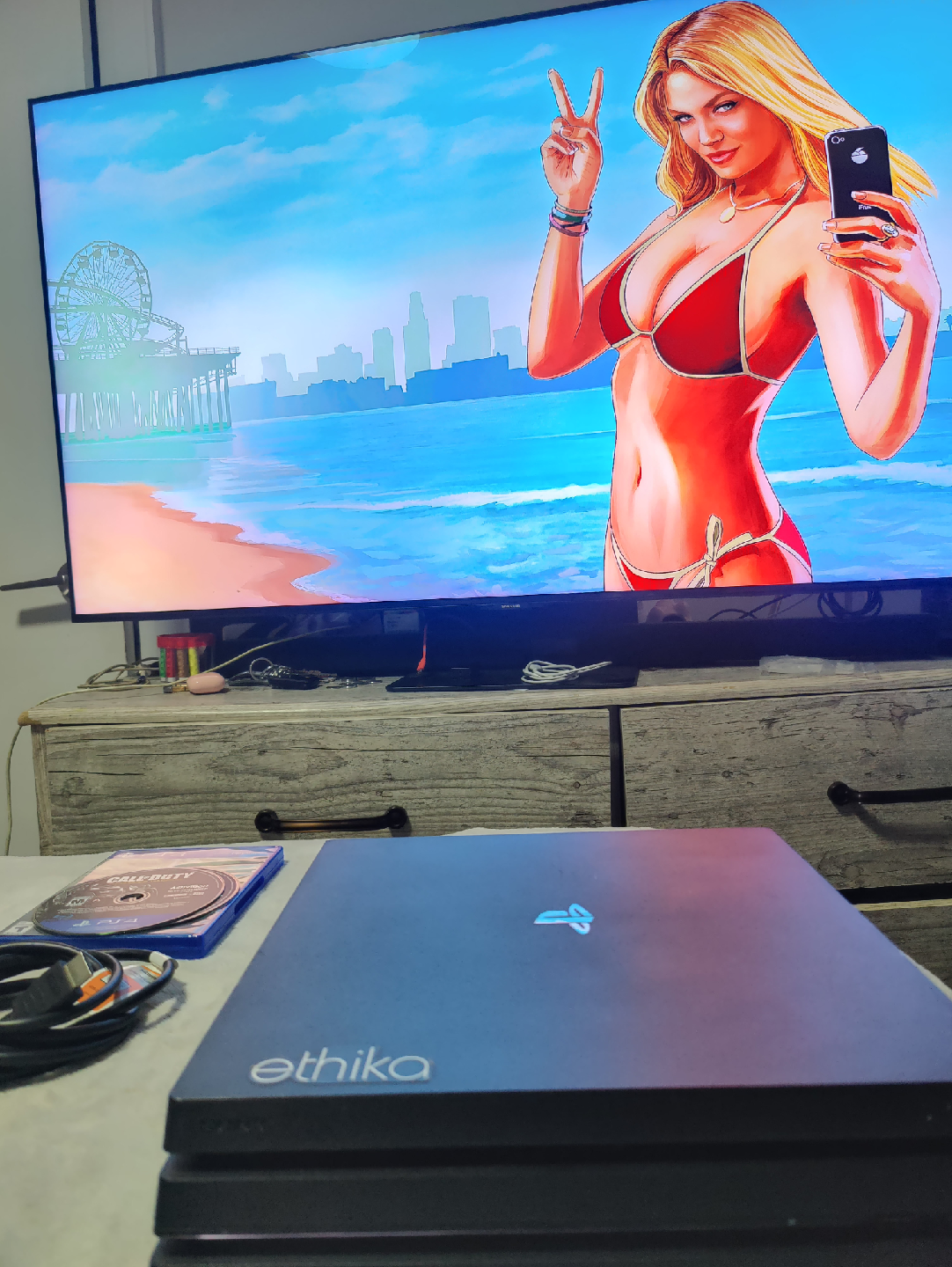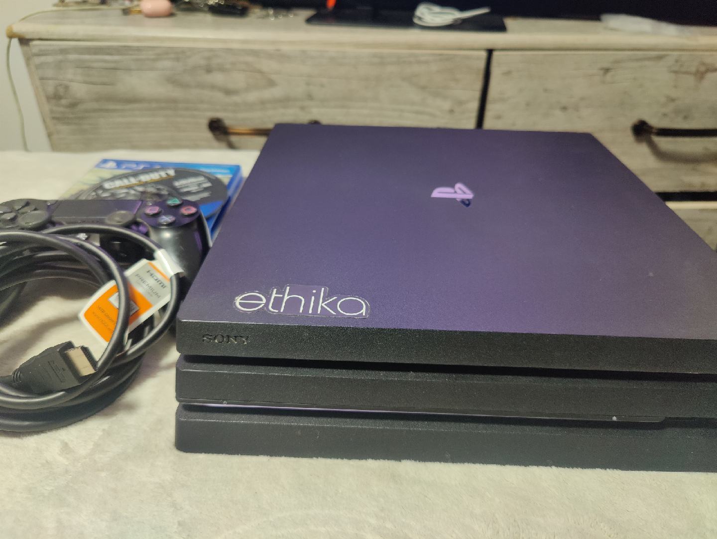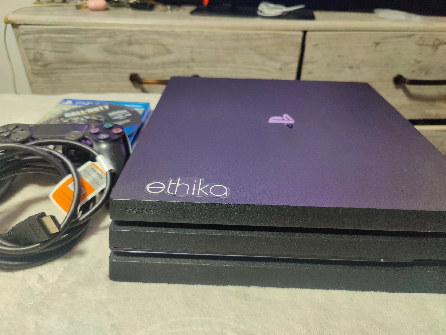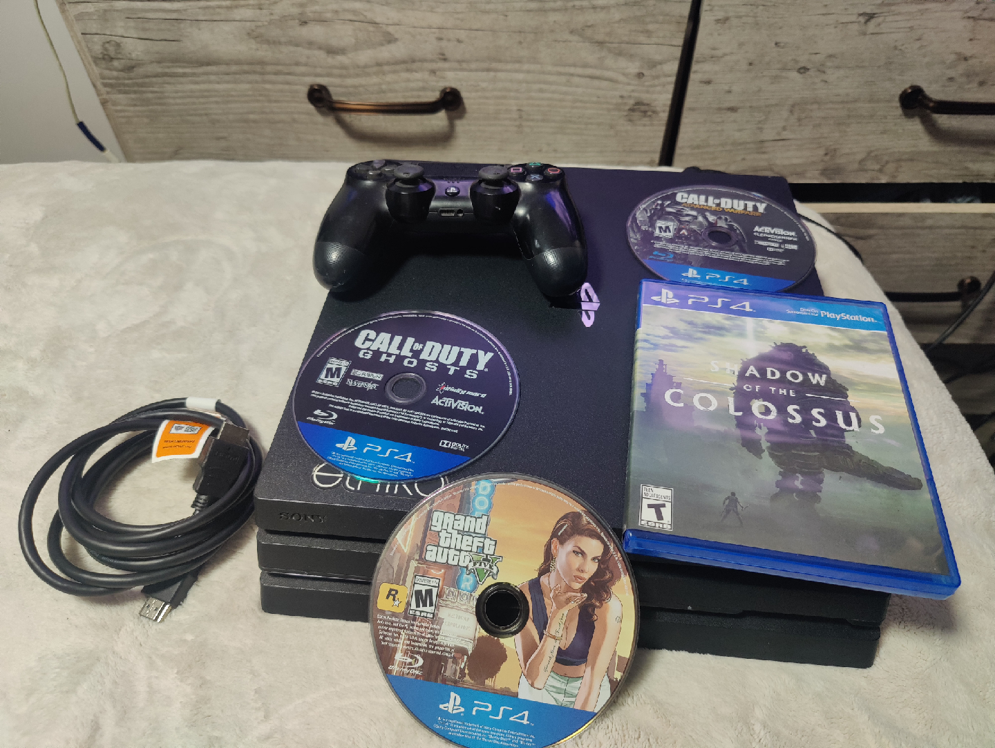 Selling a used Sony PlayStation 4 Pro. It comes with a controller and several games including Grand Theft Auto V, Call of Duty Ghosts, and Shadow of the Colossus. Also included all necessary cables.