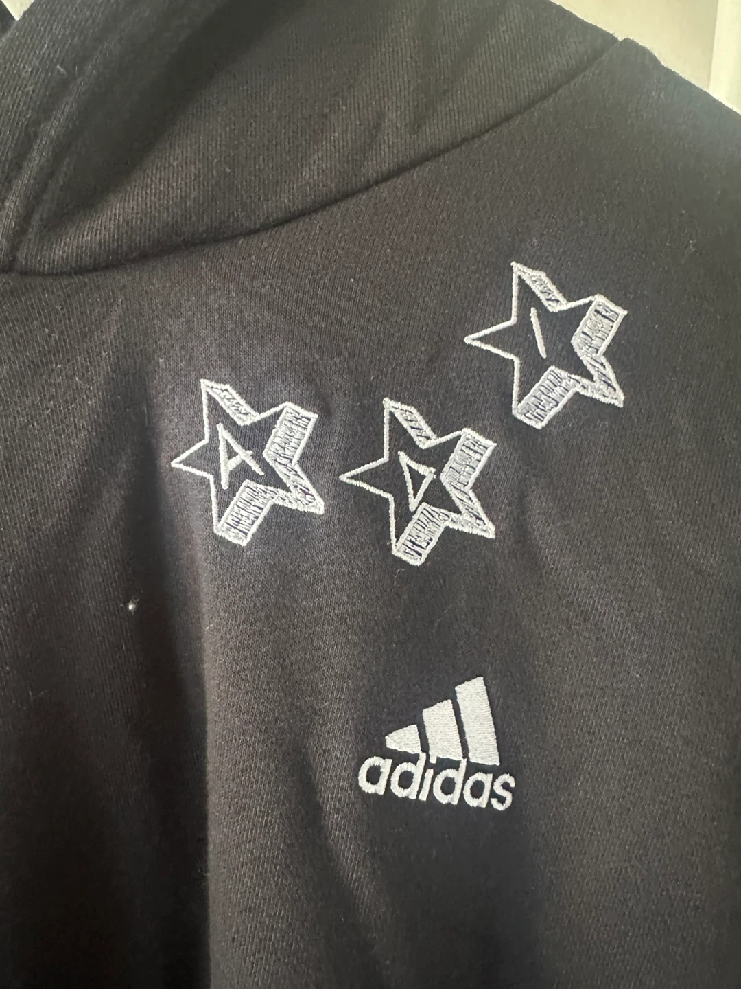 Selling a black Adidas hoodie. It features three stars and the Adidas logo on the front, and a design on the back. It's in great condition!