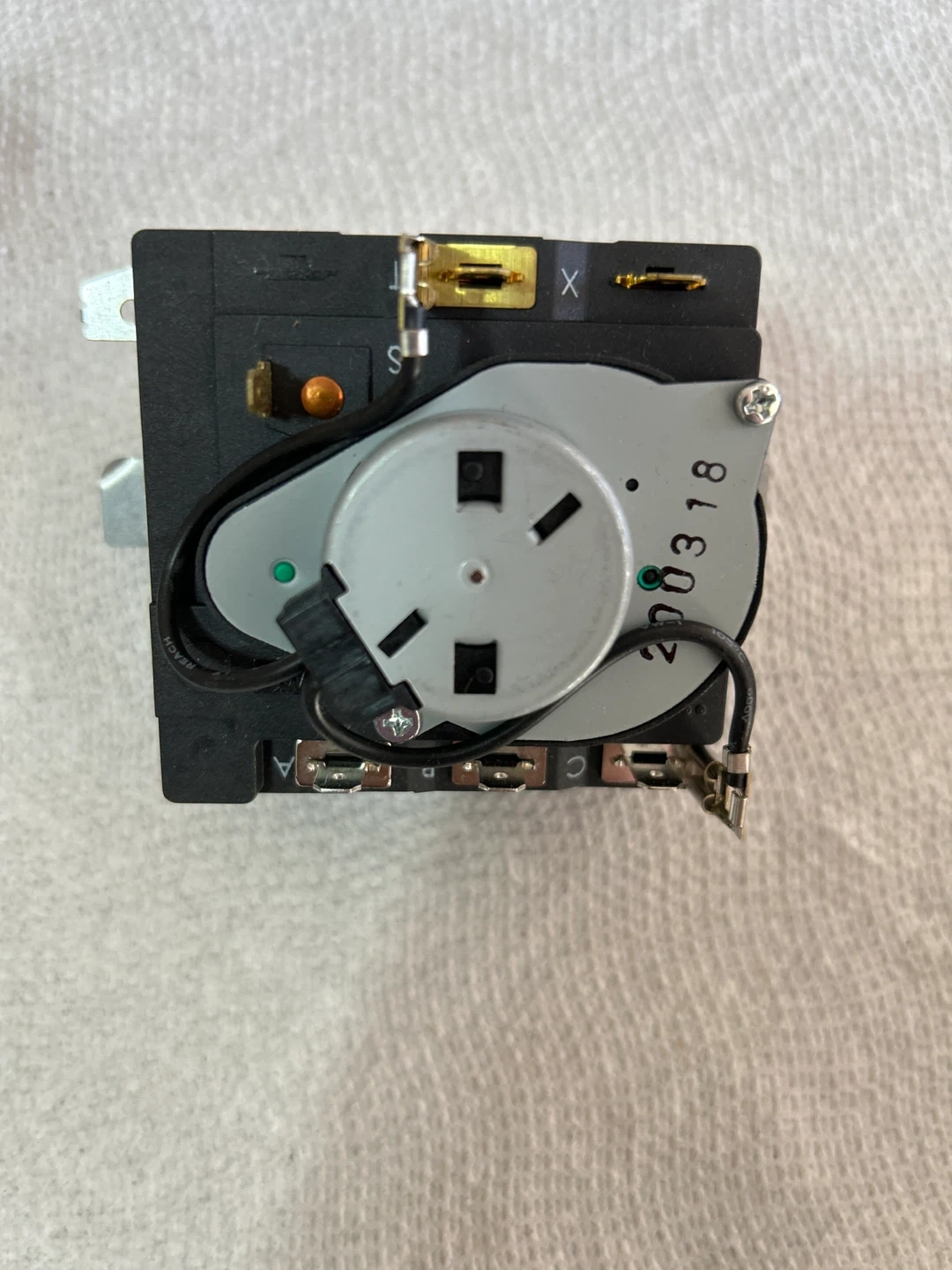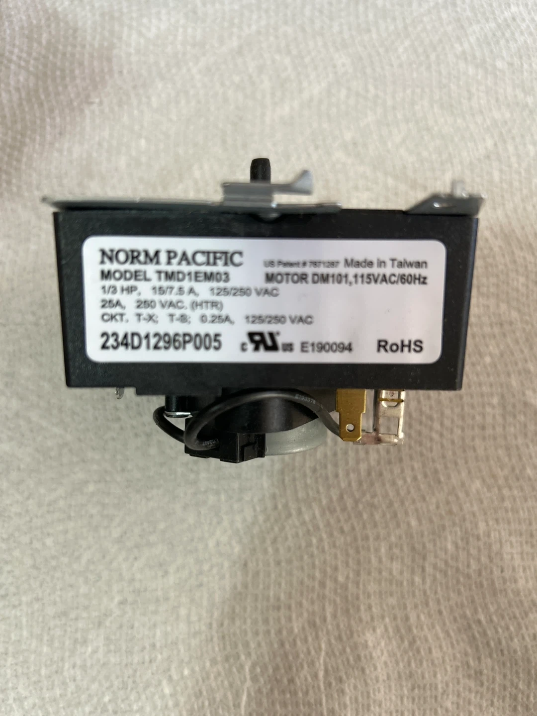 Selling a Norm Pacific motor timer, model TMD1EM03. It's marked with 1/3 HP, 15/7.5 A, 125/250 VAC and CKT. T-X; T-8; 0.25A, 125/250 VAC. It also has the number 234D1296P005 on it.