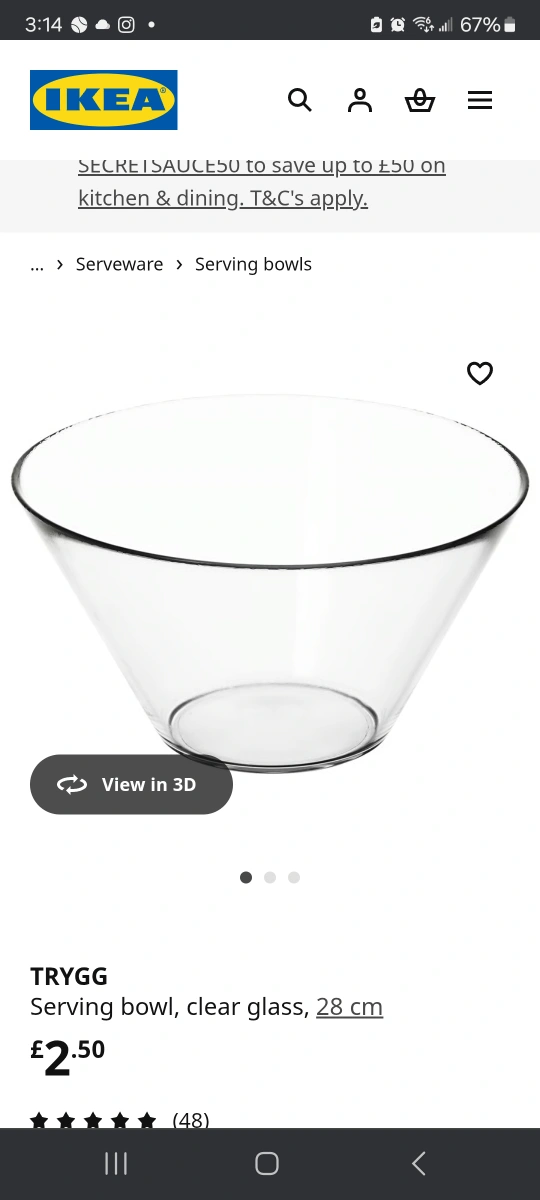 Rehoming 2 clear glass IKEA TRYGG serving Bowls. Both in great shape and ready for your next dinner party or salad creation! The bowls are 28cm in diameter, perfect for serving a variety of dishes