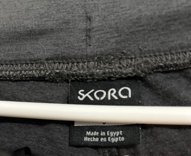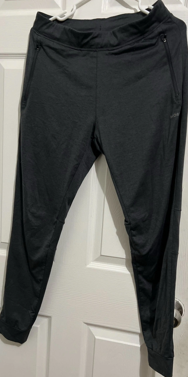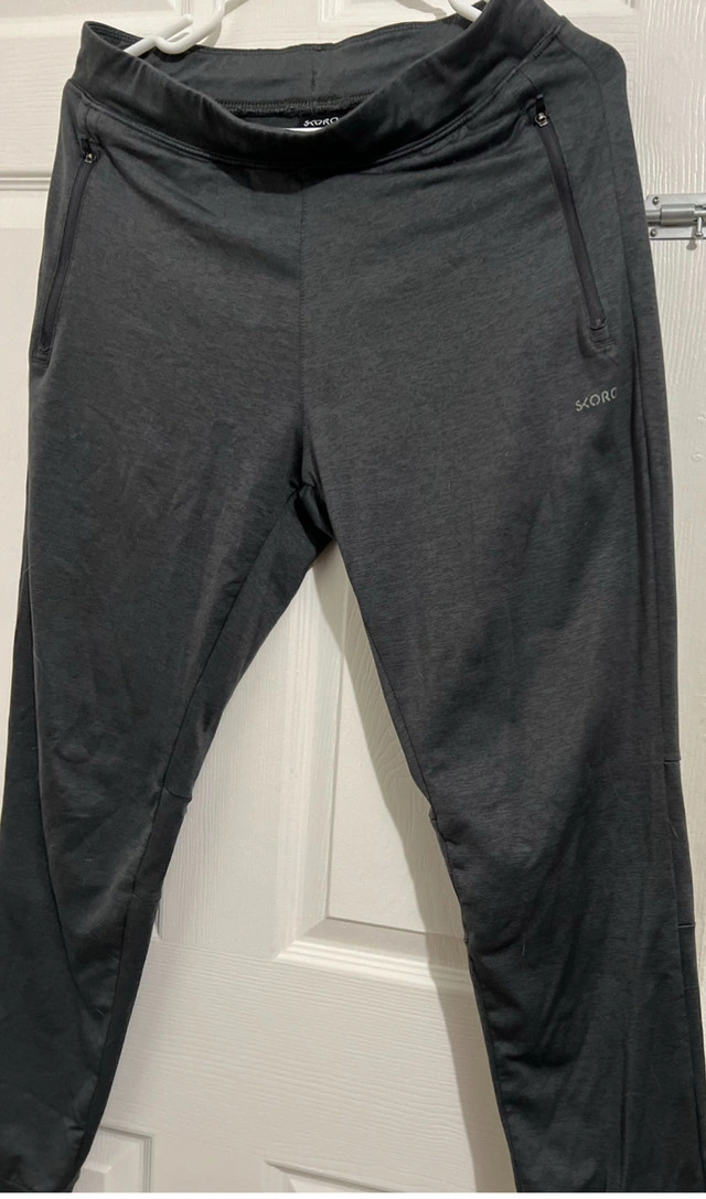 These are a pair of used Skora athletic pants, great for workouts or casual wear. They are a size small. The material is breathable and comfortable, perfect for any activity. There are 2 zipper pockets, one on each side.
