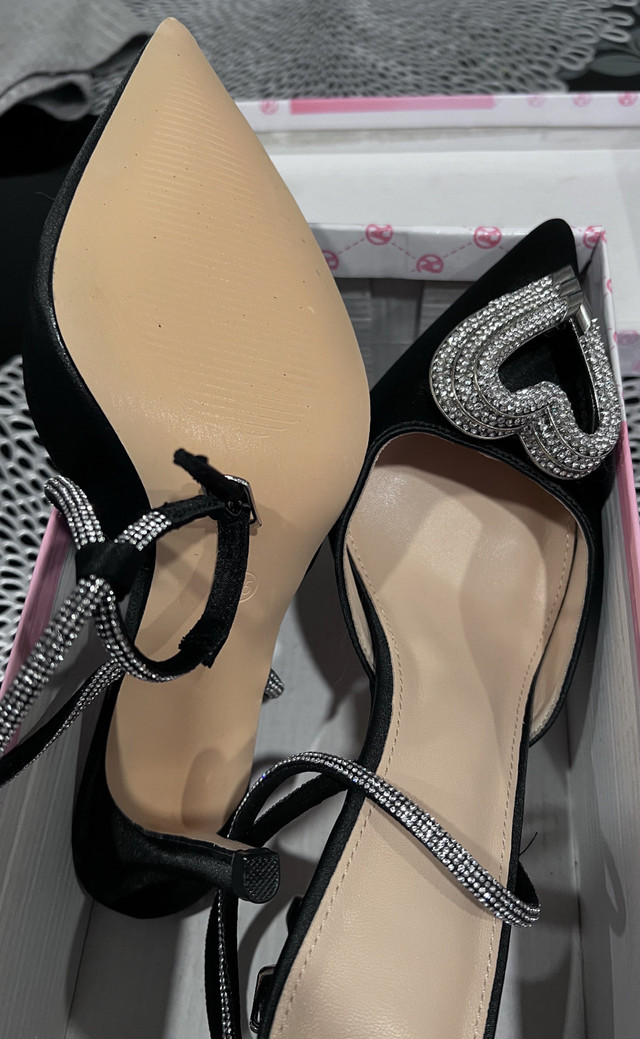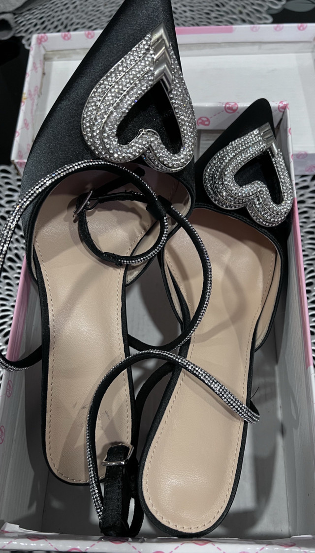 Step out in style with these Betsey Johnson black heels, size 8! These elegant heels feature a pointed toe and a unique heart-shaped, jewel-encrusted embellishment, perfect for adding a touch of glamour to any outfit.