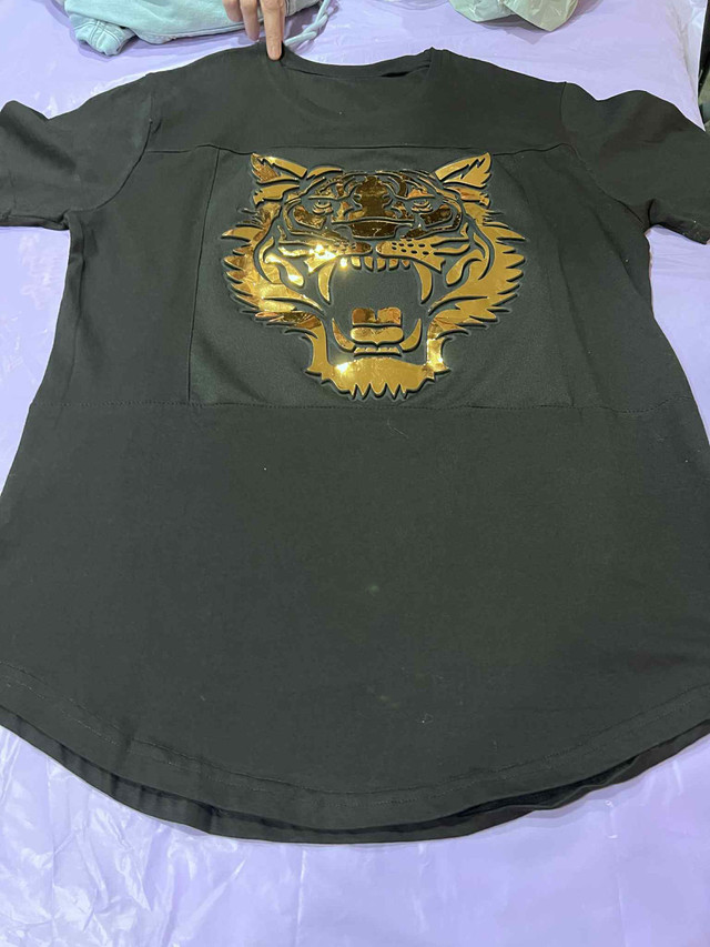 This is a pre-owned black t-shirt featuring a striking gold tiger design, perfect for adding a bold touch to your casual wear. It is in good condition, ready to be worn and enjoyed. Size M