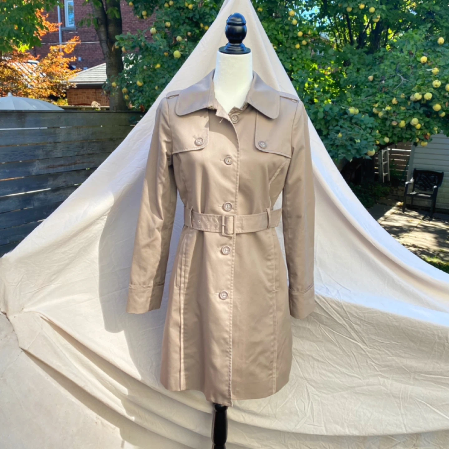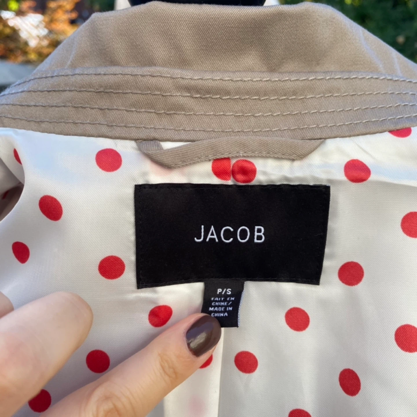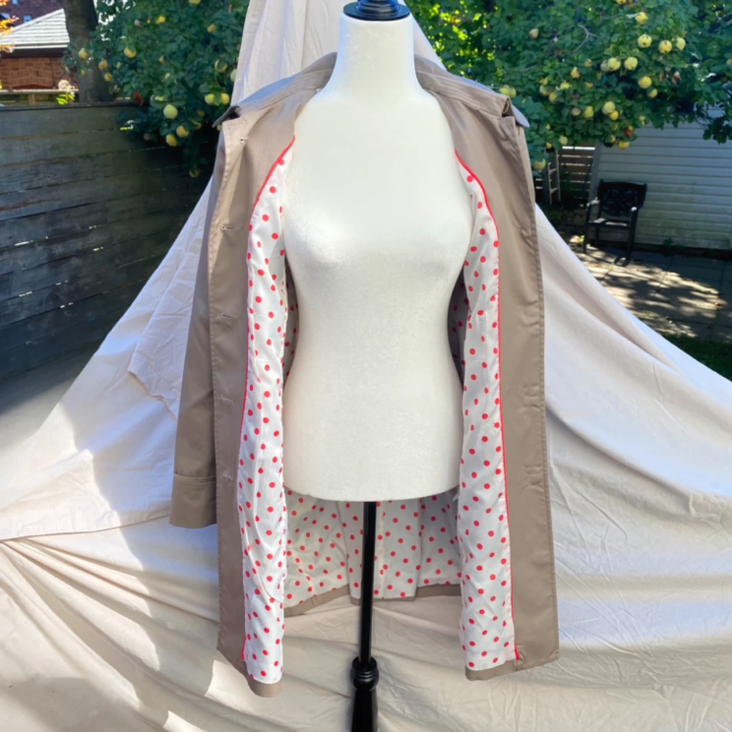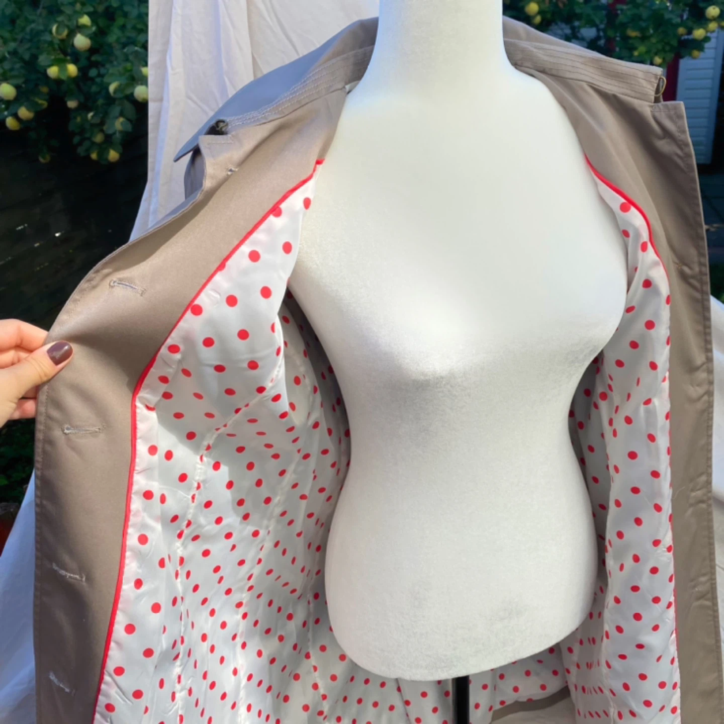 A tan trench coat. Features adjustable belt around the waist. Great for keeping you dry on a rainy day. The inner lining has red polka dots.