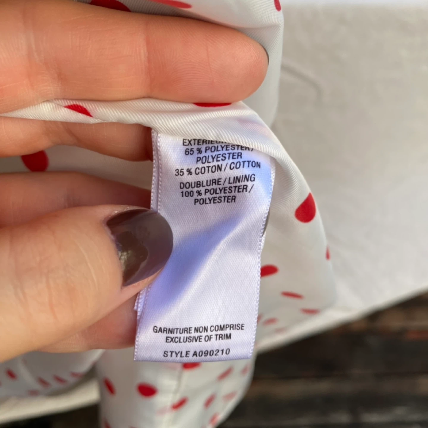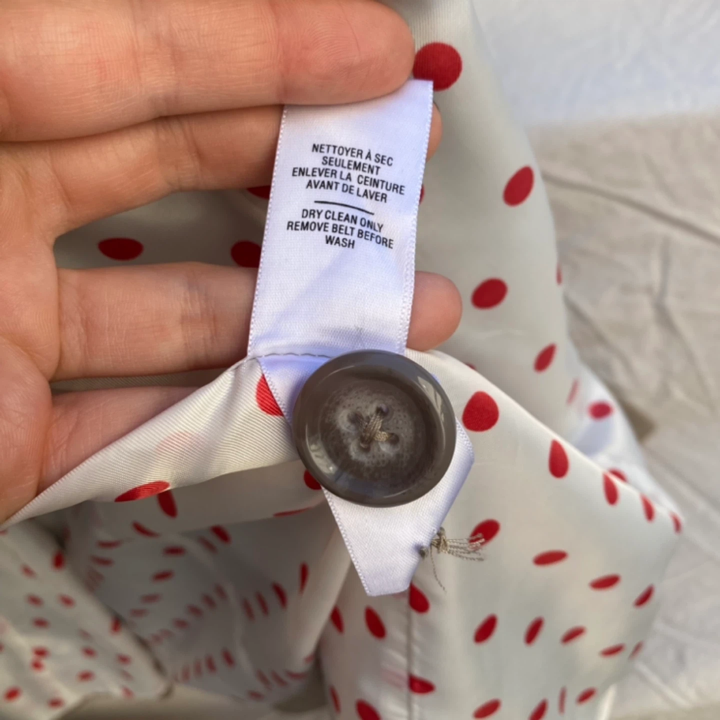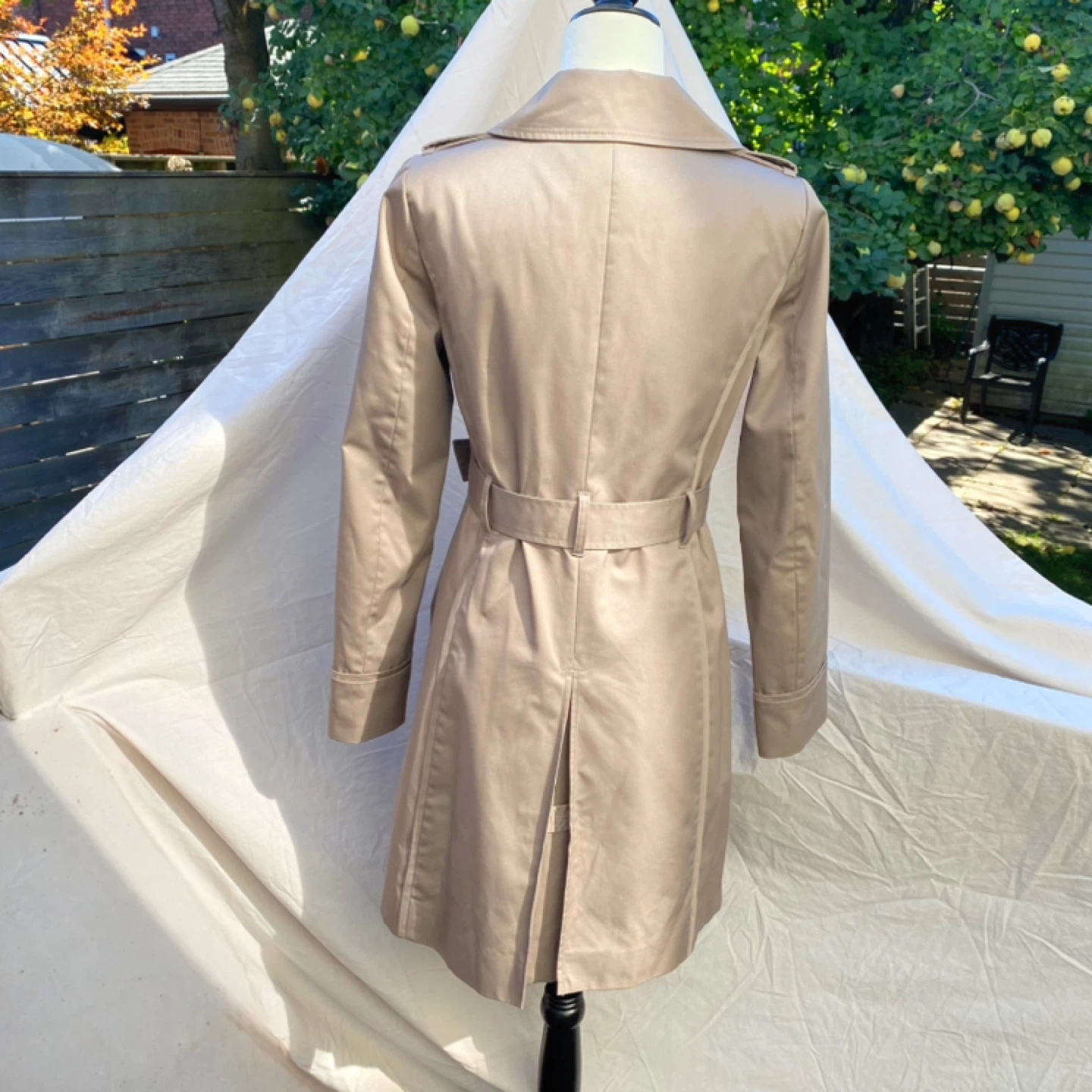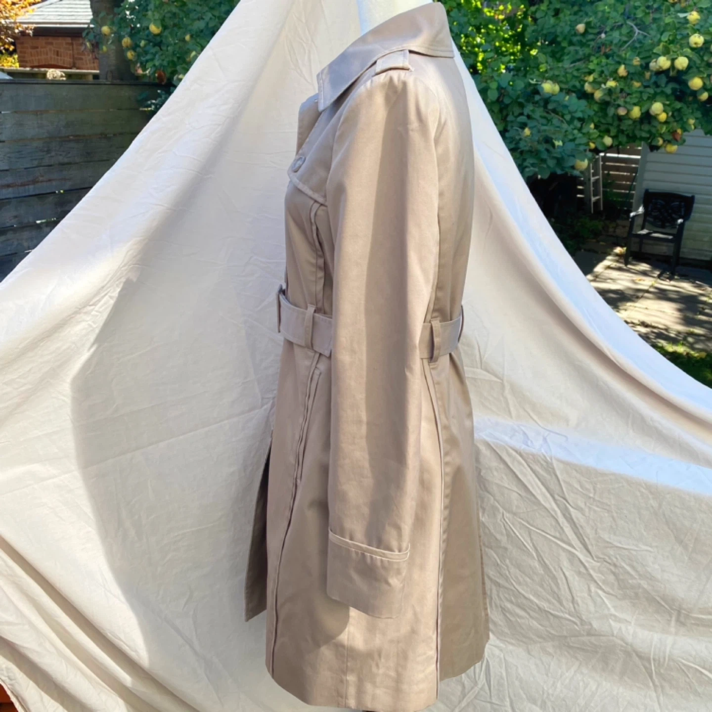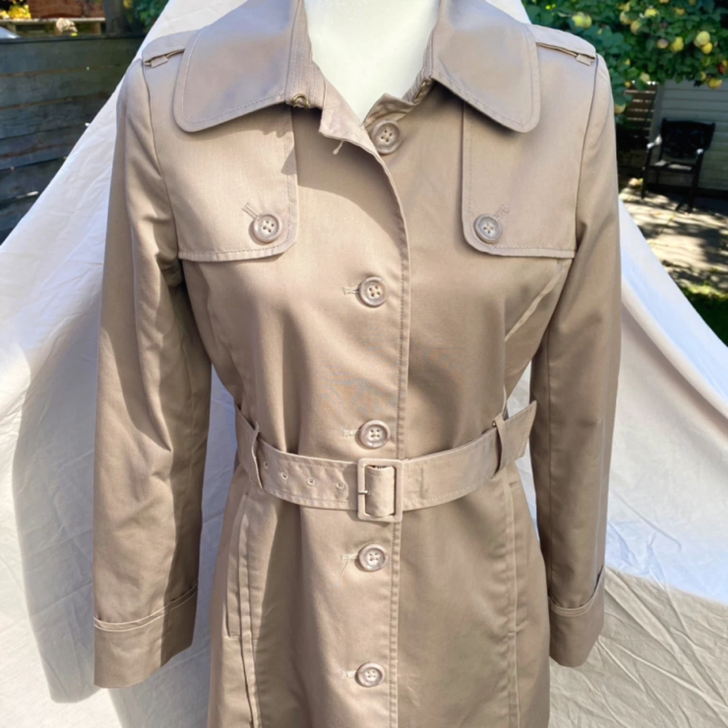 A tan trench coat. Features adjustable belt around the waist. Great for keeping you dry on a rainy day. The inner lining has red polka dots.