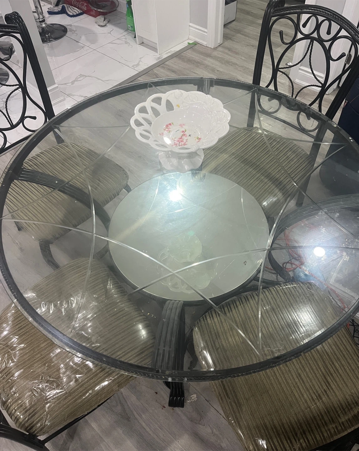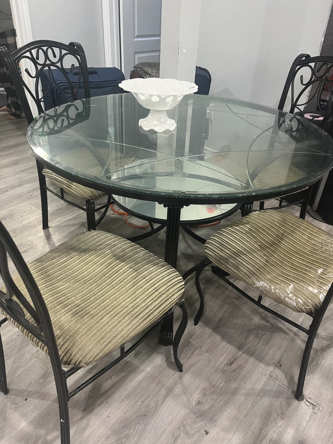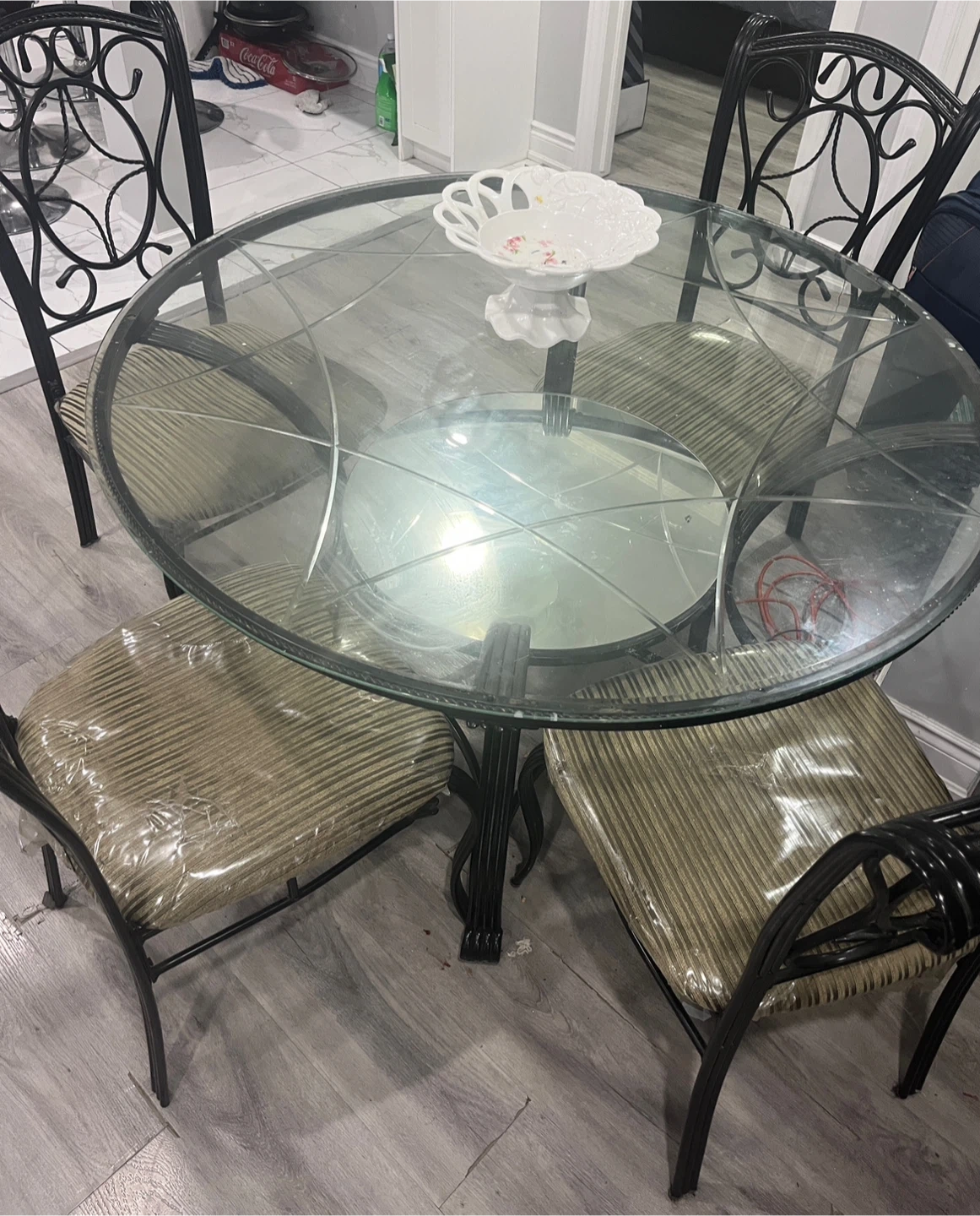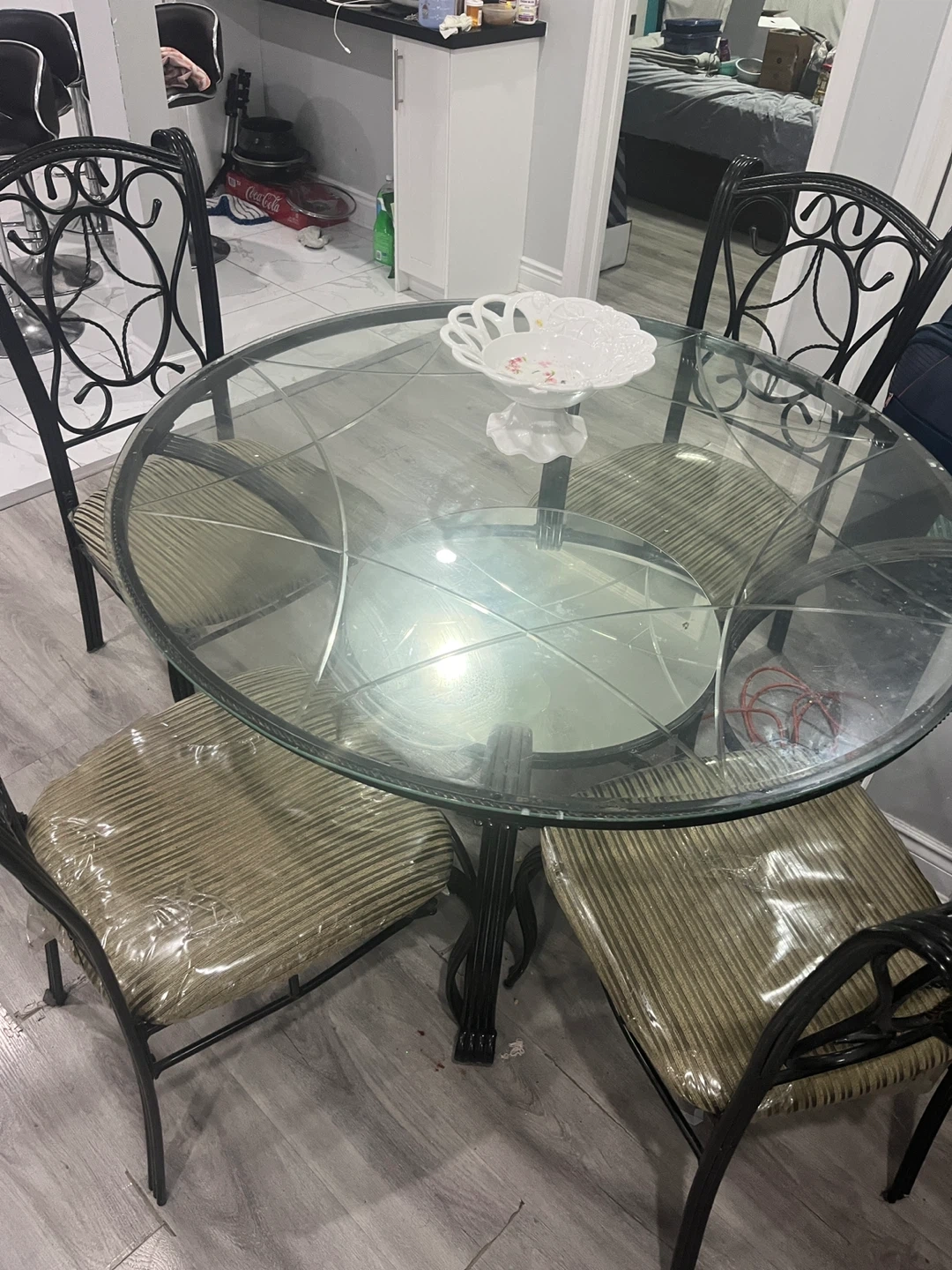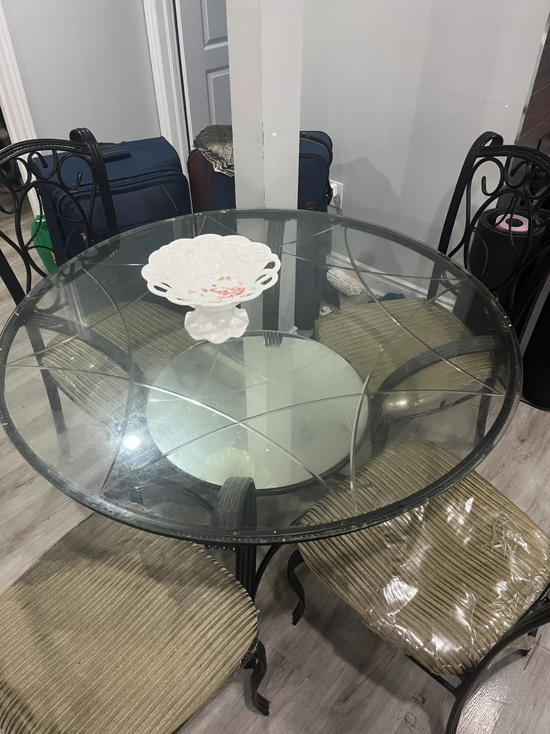 Selling a round glass top dining table that comes with four chairs! The chairs have a unique design and cushioned seats. The table features a metal frame with a glass surface, perfect for a small dining area or kitchen. The set is in good condition and ready for a new home