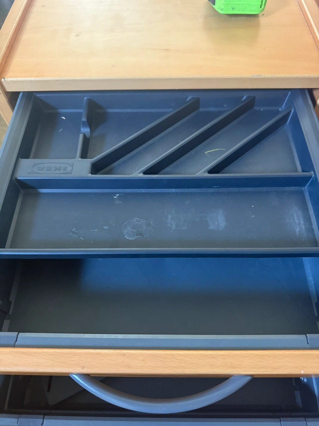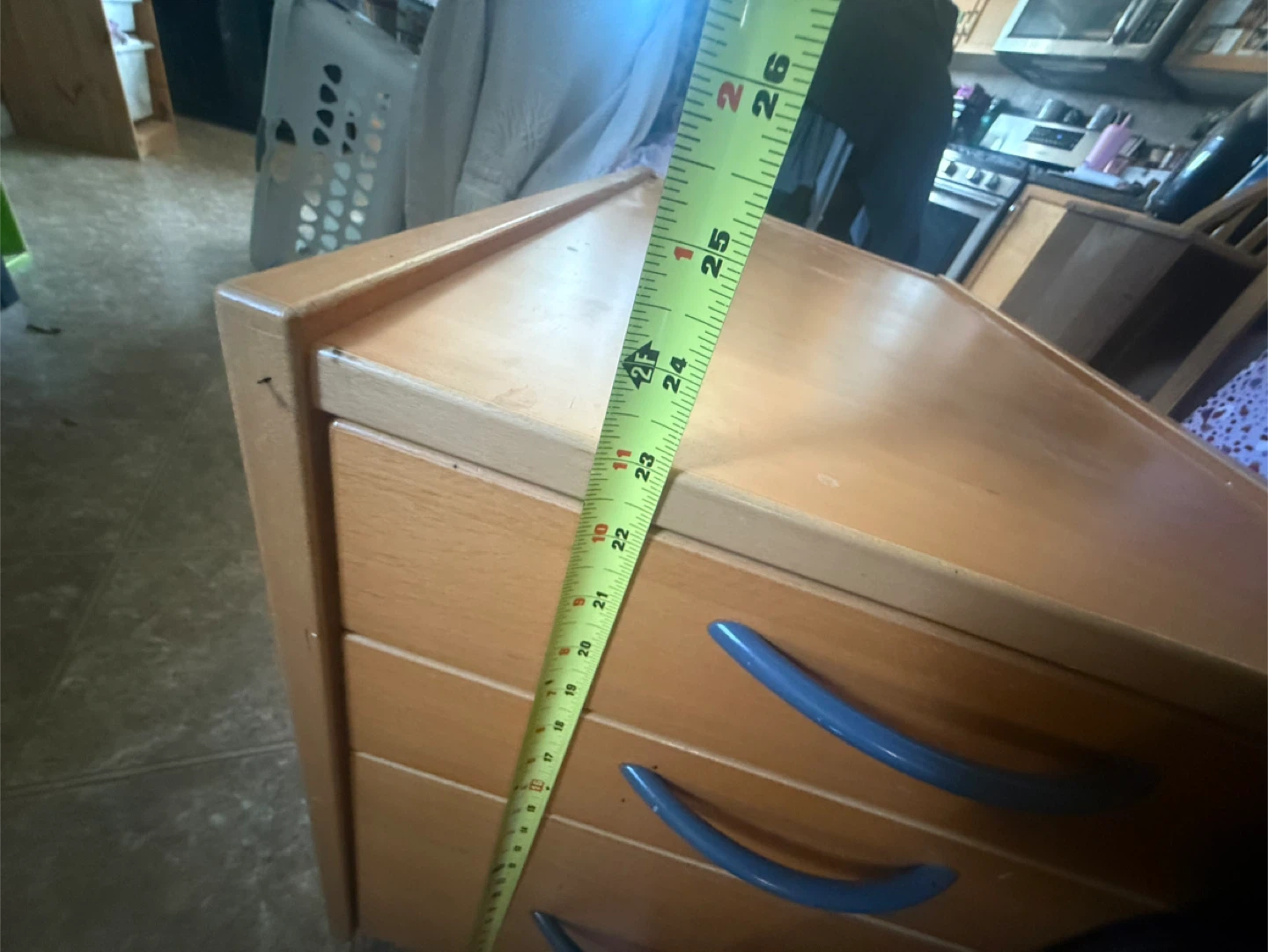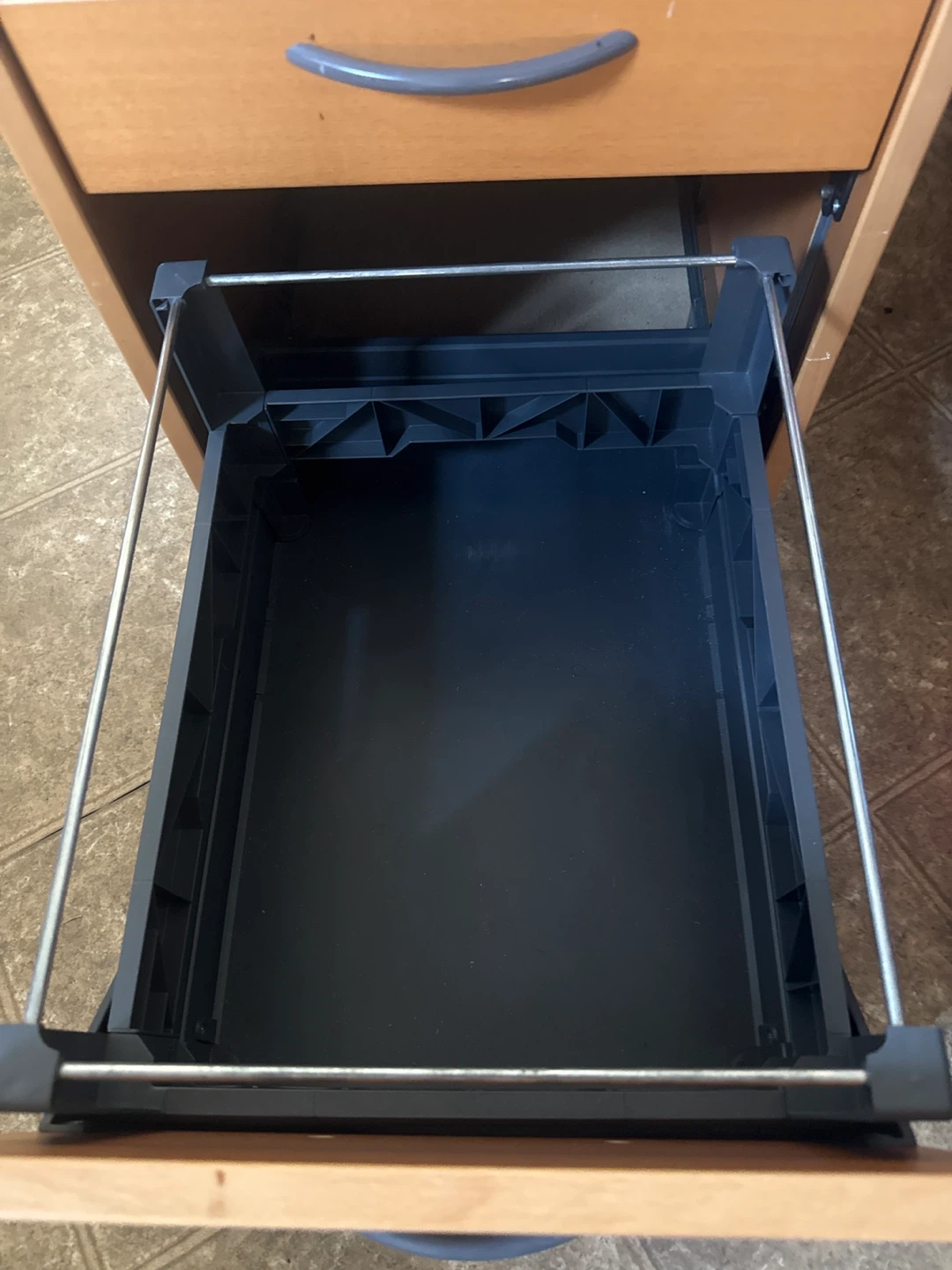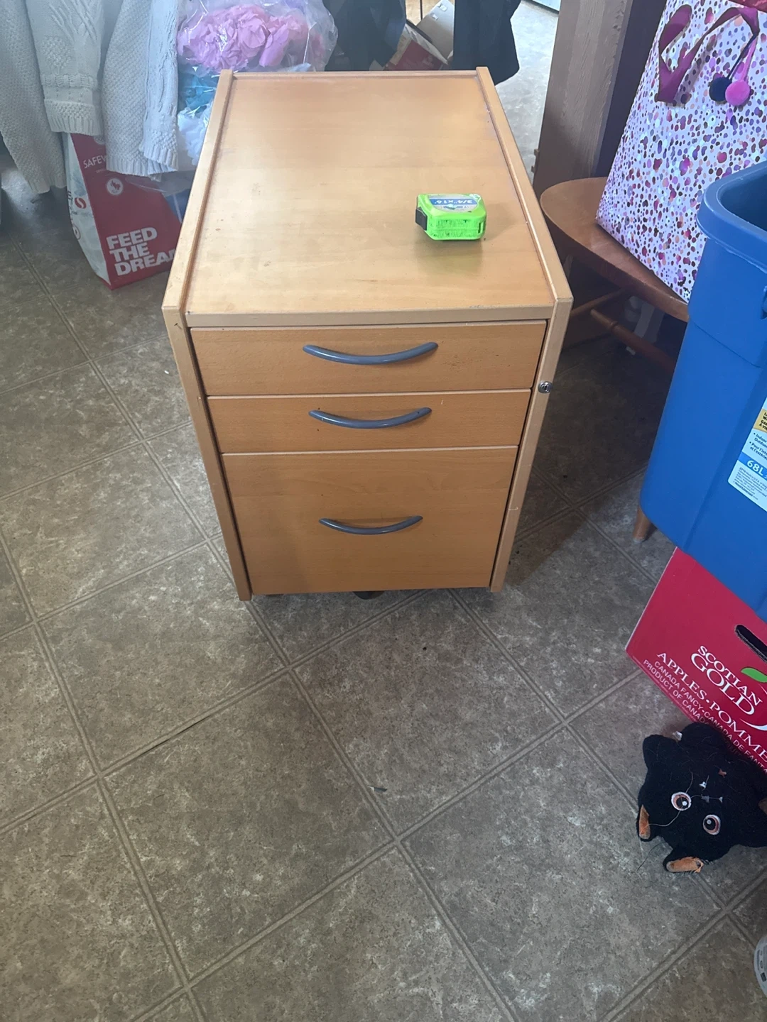I'm selling a rolling file cabinet with three drawers. It's in good shape and has a nice light wood finish. The drawers are a dark grey and have metal supports.