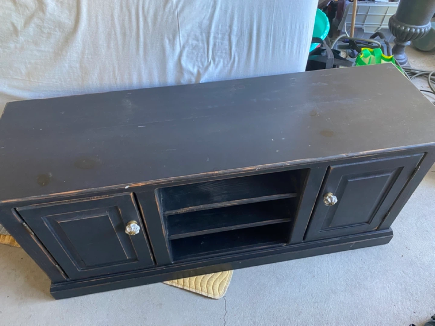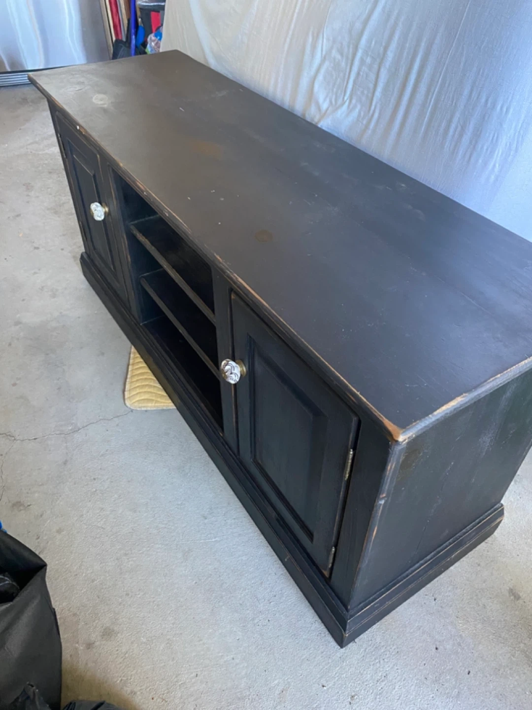Selling a black media console or TV stand. It features two doors with decorative knobs and open shelving in the middle. Perfect for storing your media devices and accessories!
