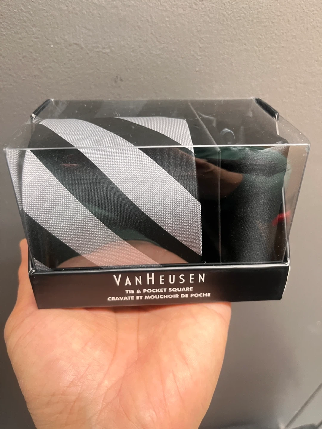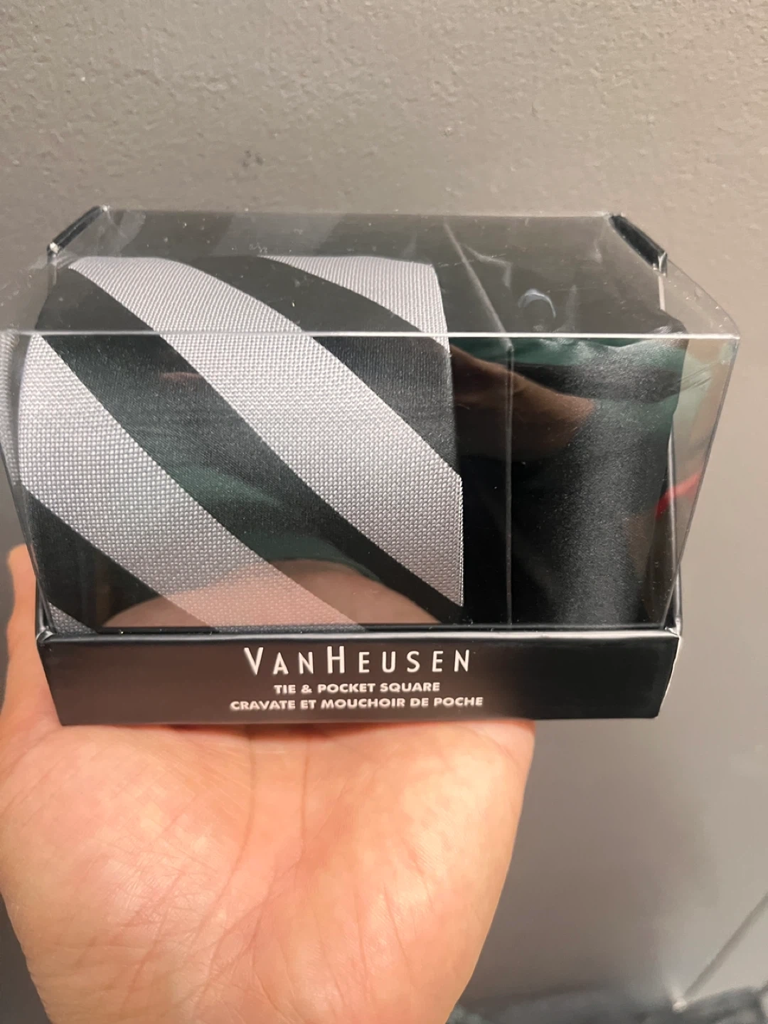 Selling a brand new Van Heusen tie and pocket square set! It comes in the original box. The tie features a stylish black and grey striped pattern, perfect for any occasion