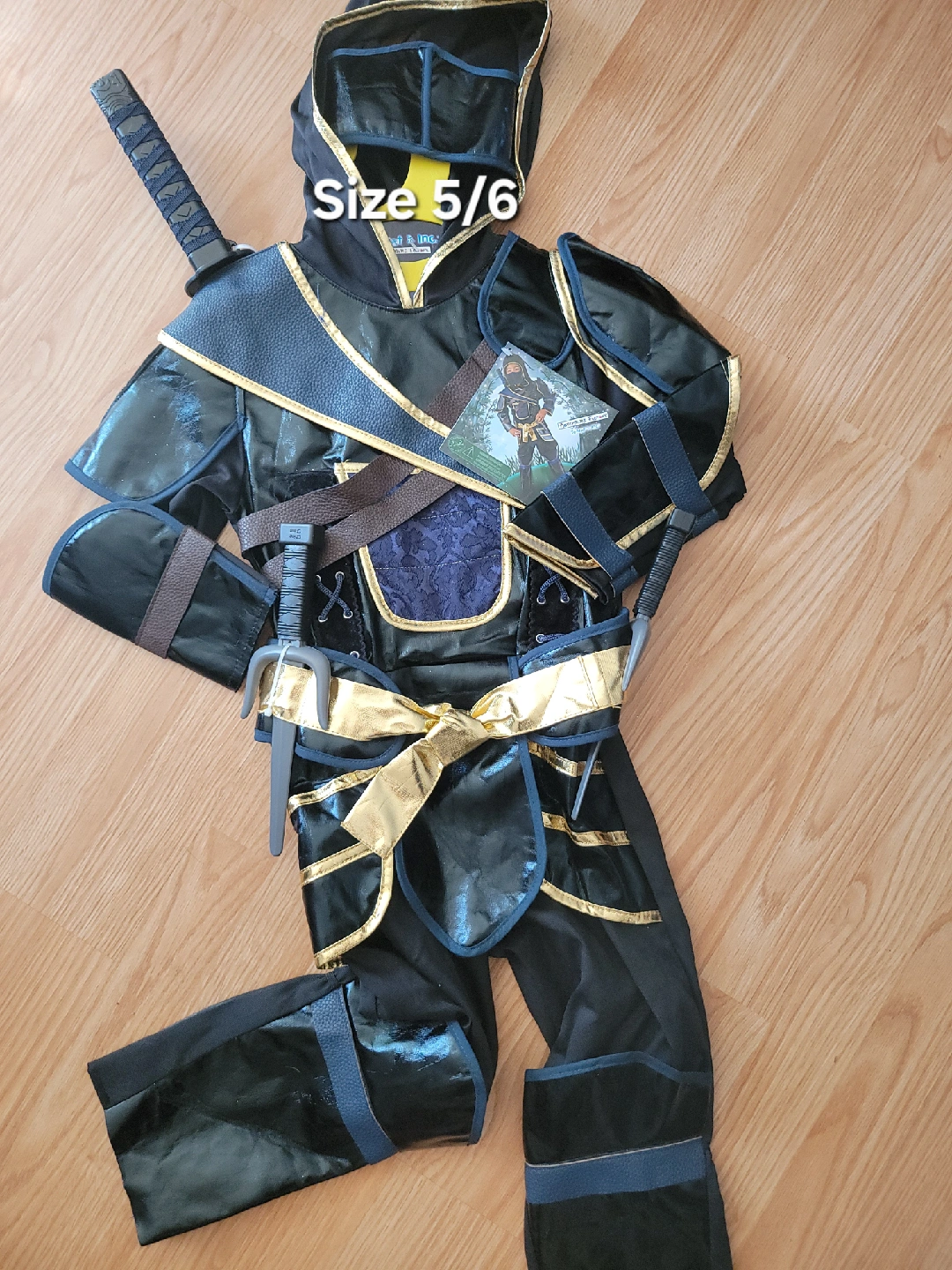 Cool ninja costume for kids! It's size 5/6 and includes all the accessories shown in the picture, like the sword and other ninja weapons. Perfect for Halloween or dress-up play!