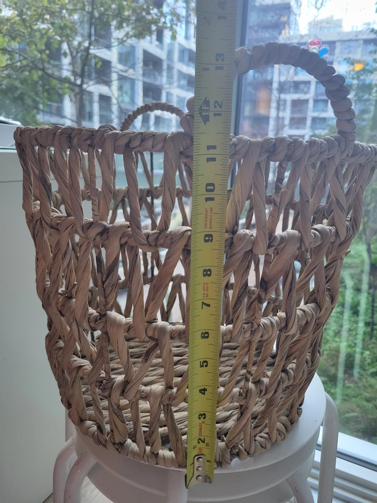 Rehoming a woven basket with handles, perfect for storage or decor! It's about 14 inches in height. It's in great shape and ready for a new home