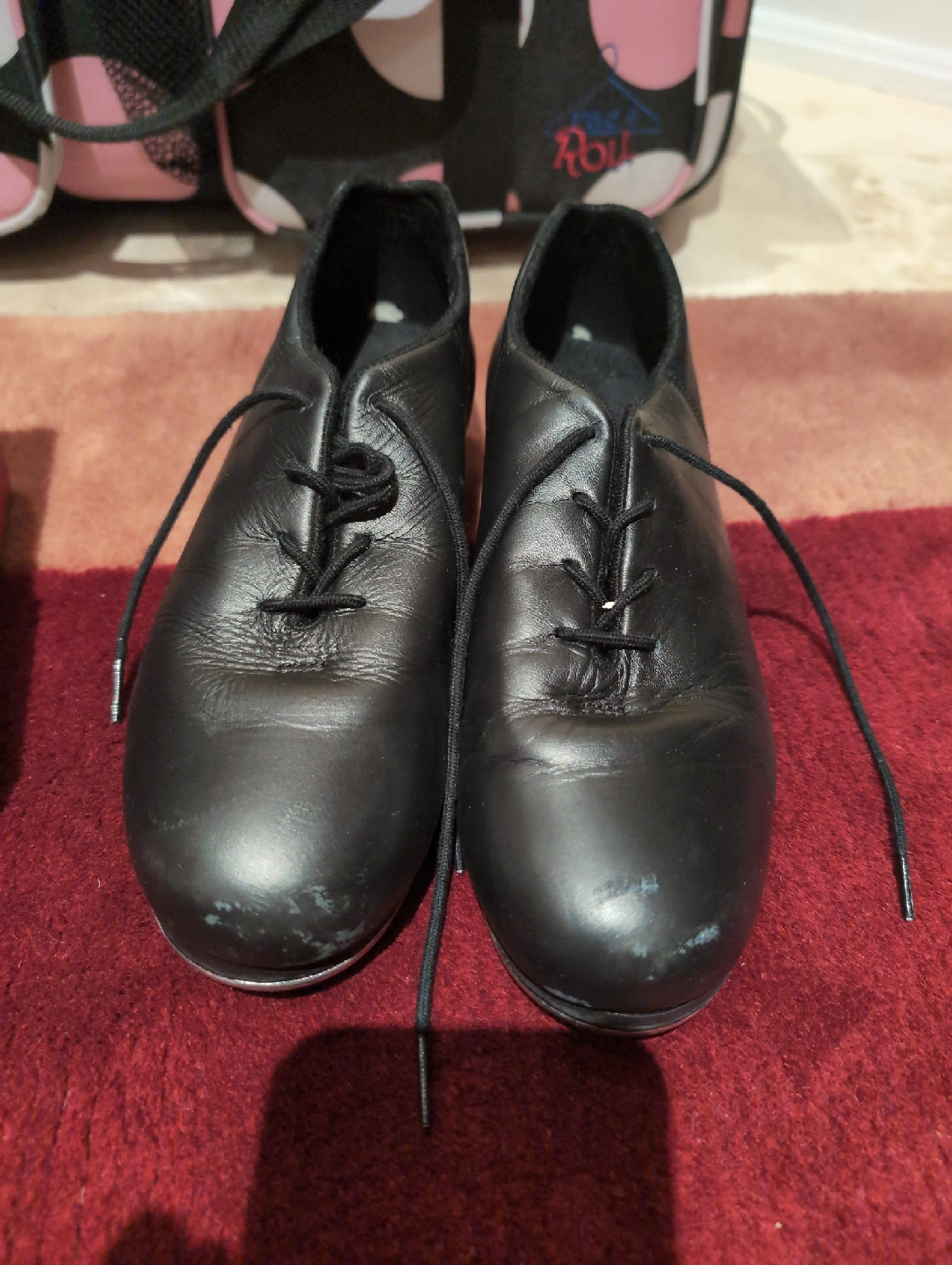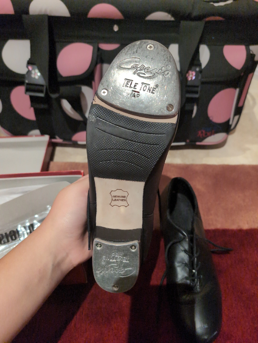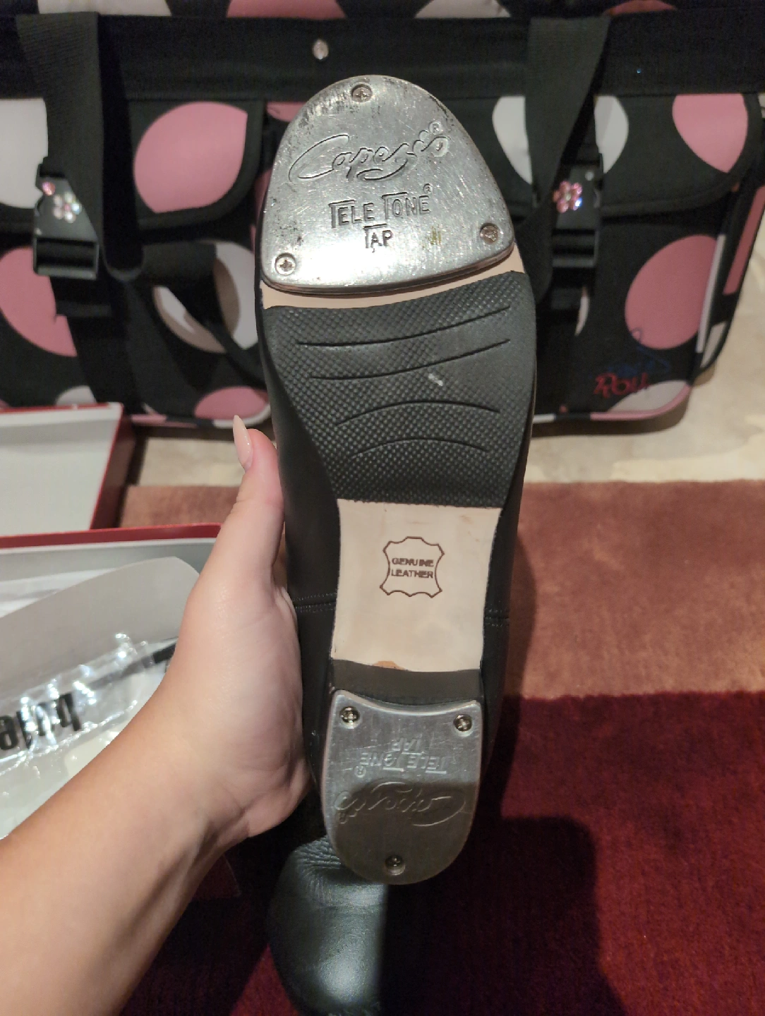 Selling a pair of Capezio Cadence tap shoes in black. They are size 9.5M. These shoes have some wear but are still in good condition for practice or performance. The original box is included!
