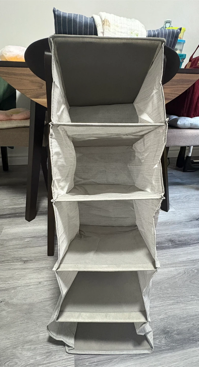 Declutter your closet with this handy hanging organizer! It features four shelves, perfect for storing sweaters, shoes, or accessories. Easy to install and a great space saver for any closet