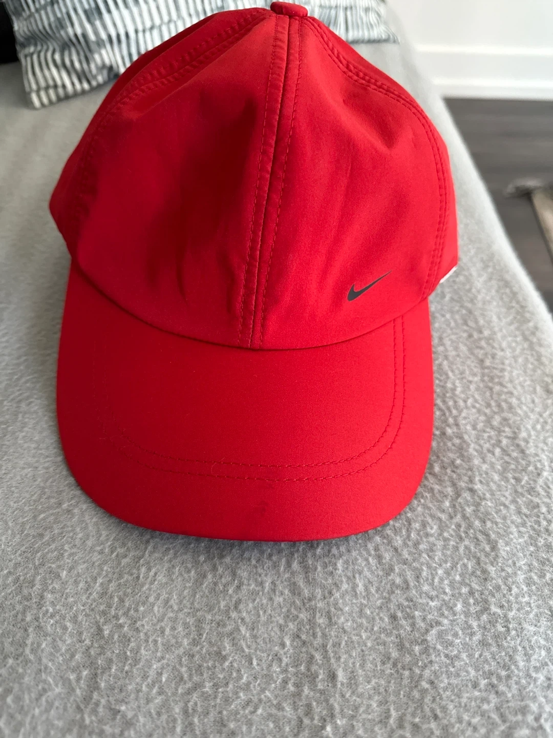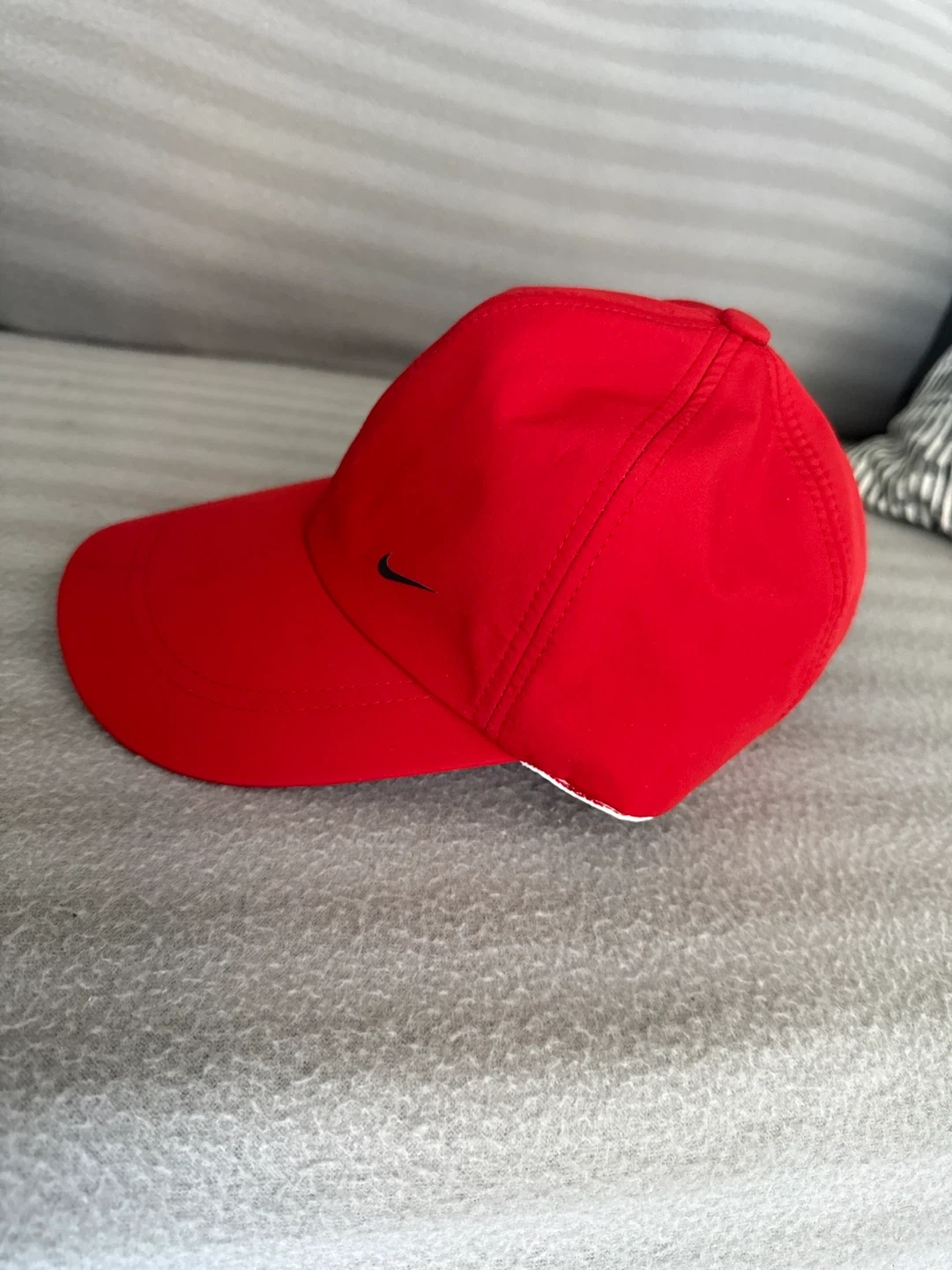 628Selling a bright red Nike baseball cap! It's in great condition and ready for a new home. The classic design and vibrant colour make it a stylish and practical accessory for sunny days or workouts