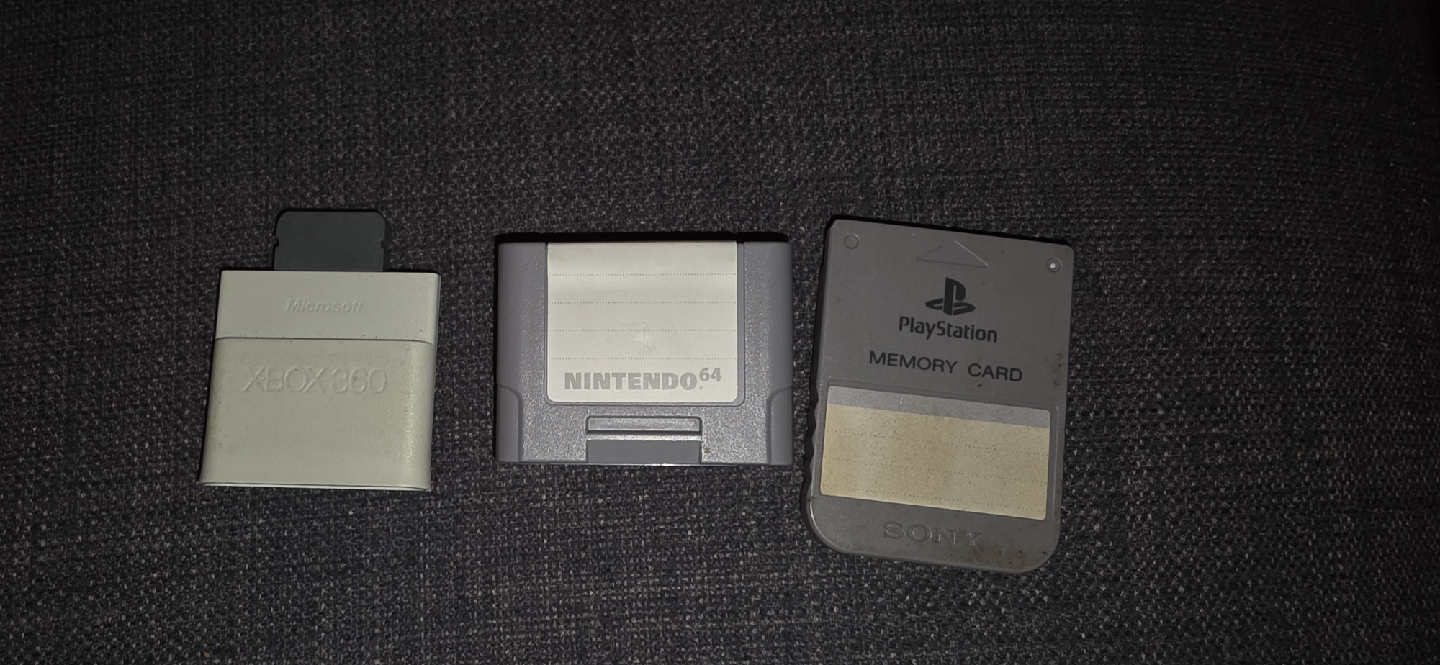 Selling a collection of memory cards for classic consoles! Includes a Microsoft Xbox 360 memory card, a Nintendo 64 memory card, and a Sony Playstation memory card