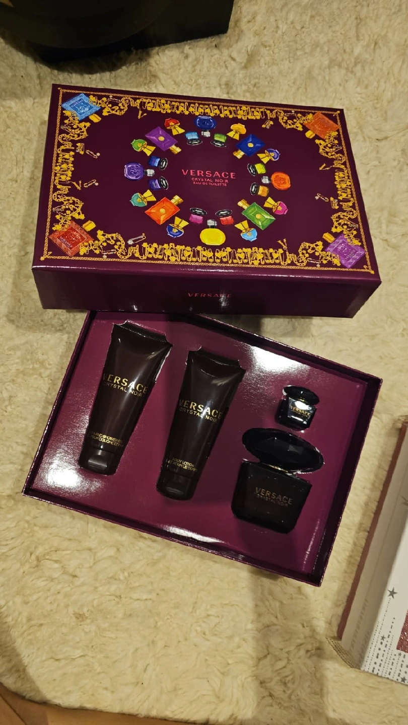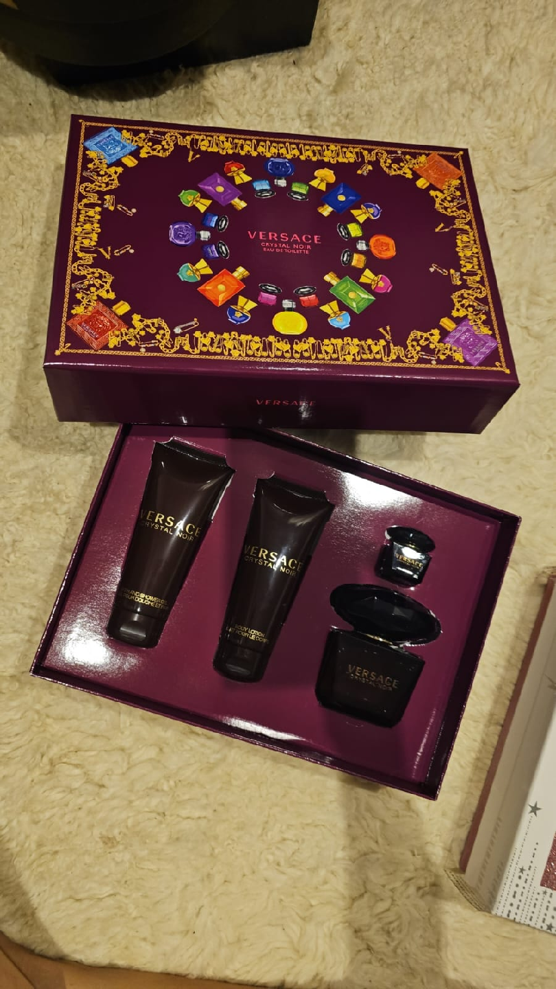 Selling a Versace Crystal Noir gift set! It includes a bottle of Eau de Toilette, a body lotion, and a shower gel. The set comes in its original box, making it a perfect gift or a treat for yourself