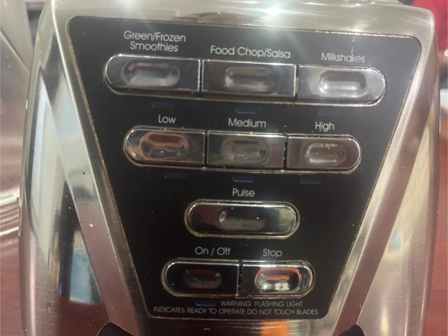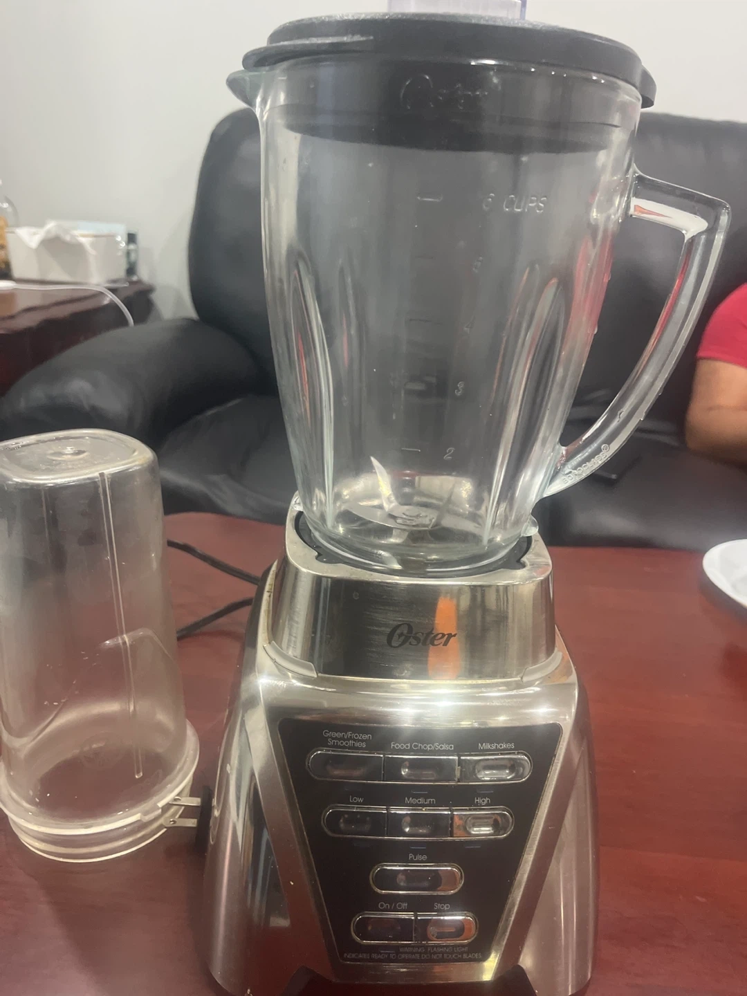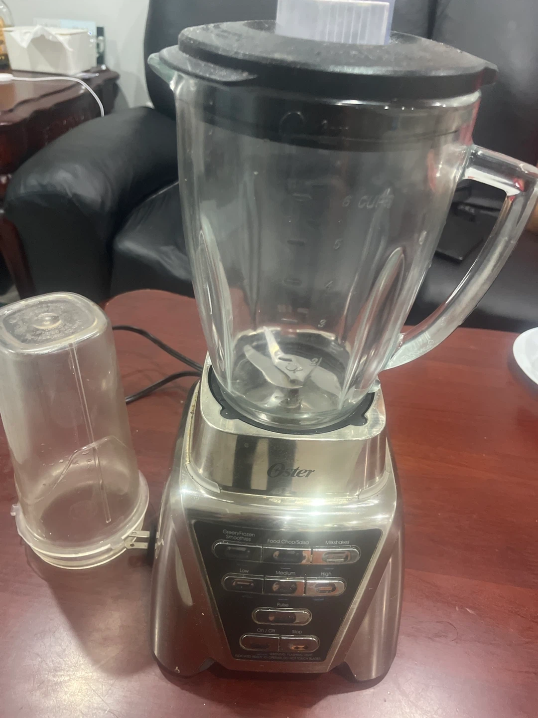 Selling an Oster blender that's in great shape! It has a 6-cup capacity and multiple settings for different blending needs, like green/frozen smoothies, food chop/salsa, and milkshakes. It also includes a smaller blending cup. Perfect for making your favourite drinks and recipes!