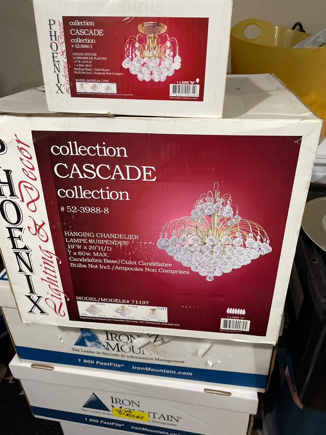 Phoenix Lighting & Decor Cascade collection chandelier for sale! This is a hanging chandelier (lampe suspendue) that measures 19"W x 20"H/D. It uses 7 x 60w max candelabra base bulbs (bulbs not included). It comes in its original box