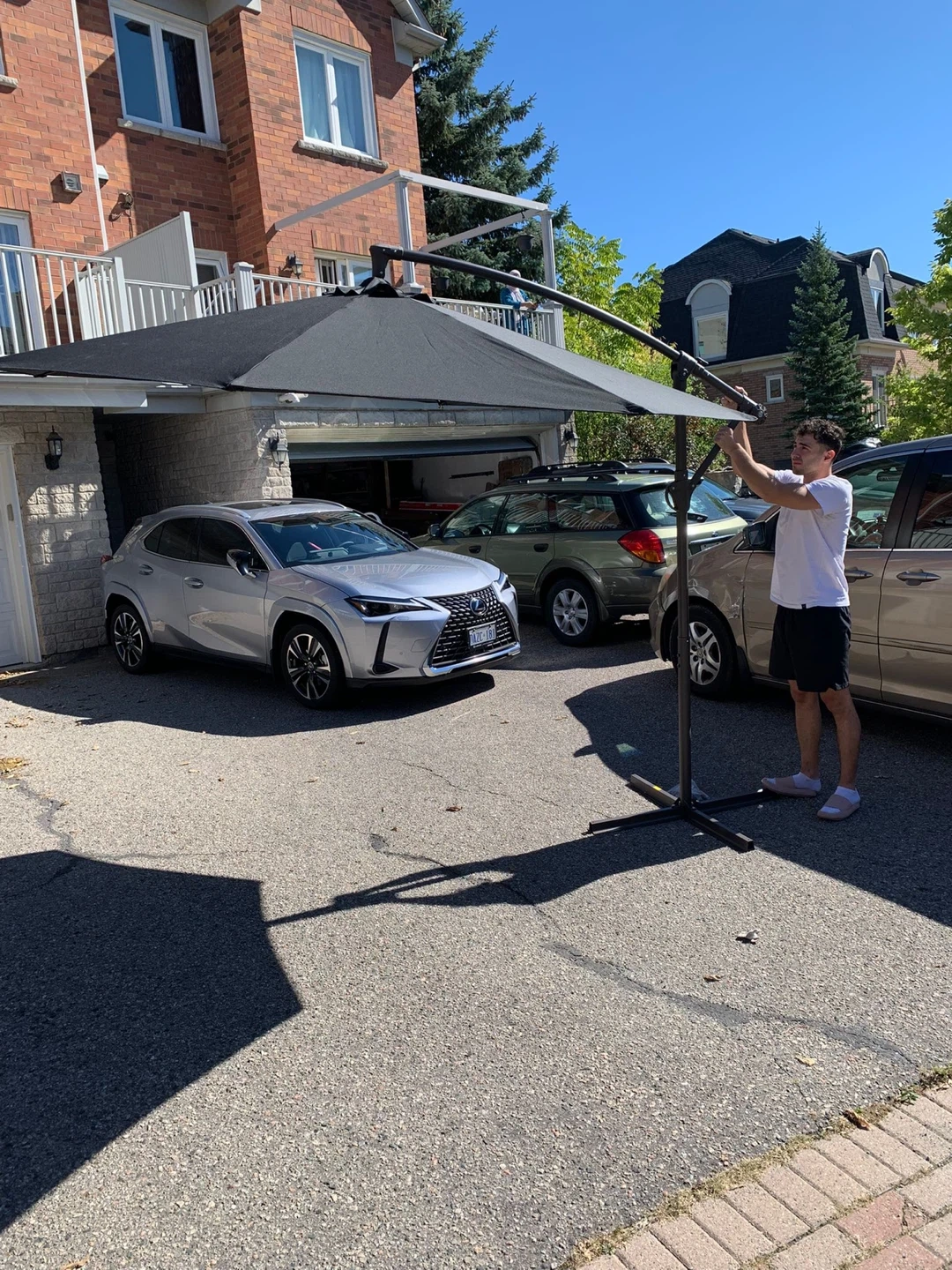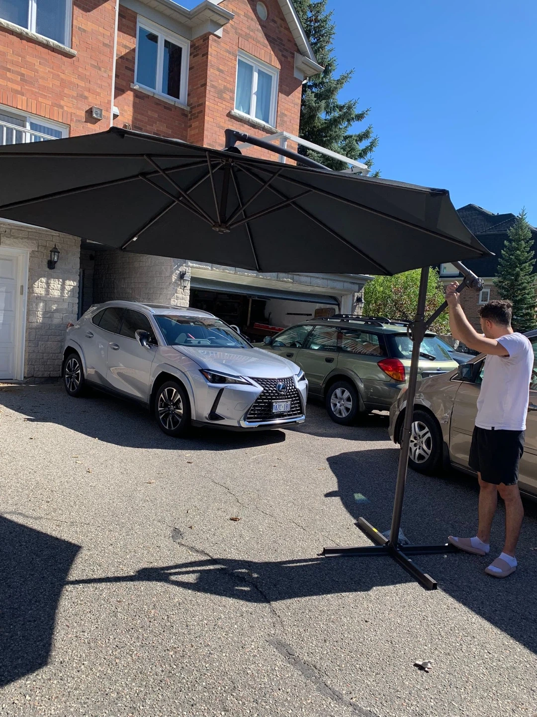433Selling a cantilever patio umbrella in black. It's perfect for providing shade and enjoying the outdoors. Originally bought for $369.99.