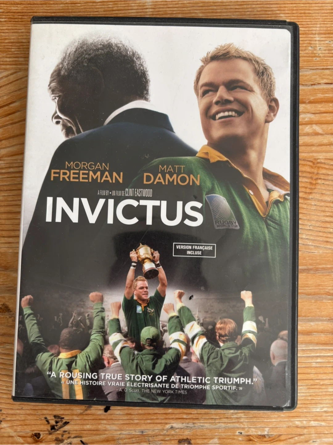 Selling the DVD of Invictus, starring Morgan Freeman and Matt Damon! It's a film by Clint Eastwood and includes the French version