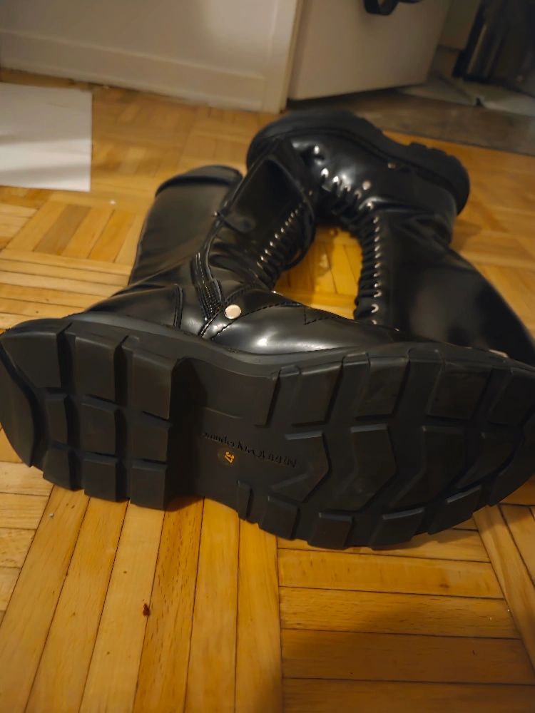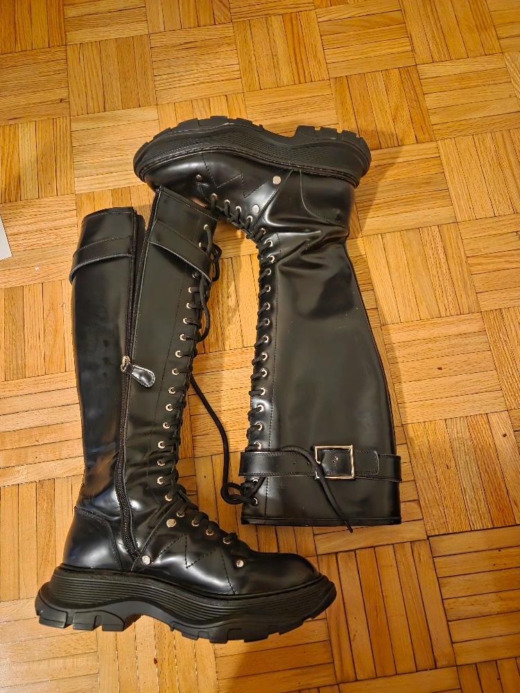 Selling a pair of Alexander McQueen knee-high boots in black leather! They are a size 37 and feature a lace-up design with buckle detailing. The boots have a chunky, lugged sole. Great for adding an edgy touch to any outfit