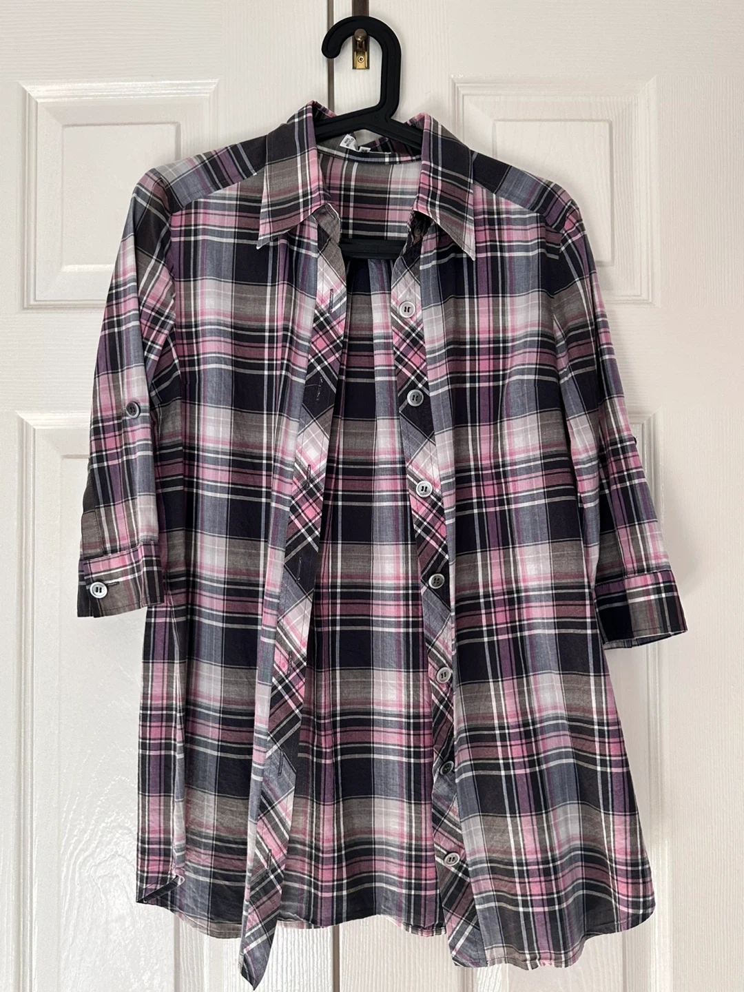 Selling a cute plaid button-up shirt! The colours are a mix of pink, black, and white in a classic plaid pattern. It's in great condition and perfect for layering or wearing on its own. It has ¾ sleeves. Fits small-medium.