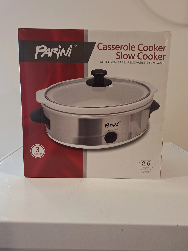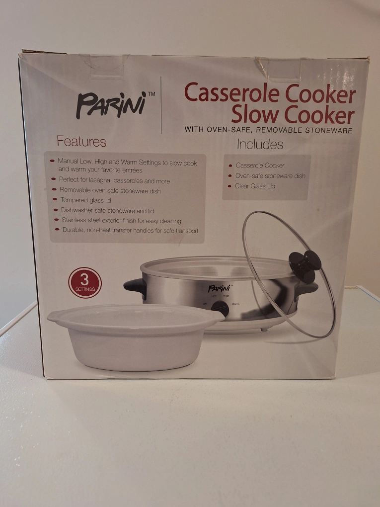 I'm selling a brand new Parini casserole and slow cooker! It is still in its original packaging. This is a 3 piece set with a 2.5 quart capacity and removable stoneware. It's oven-safe, too!