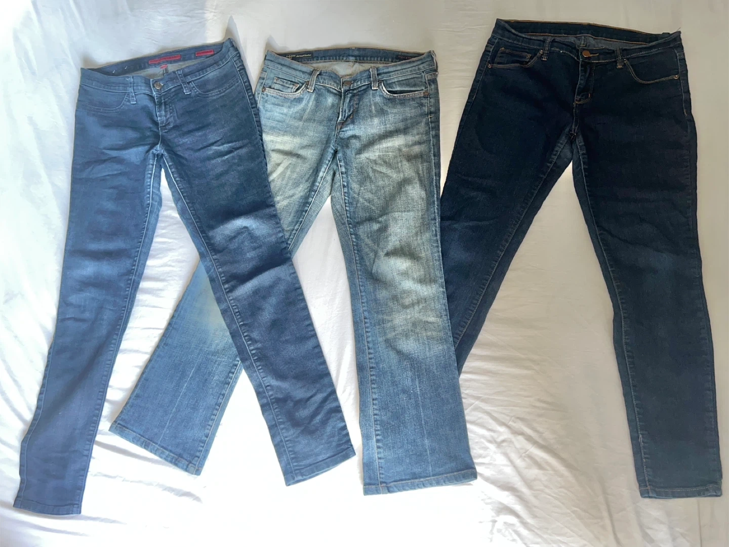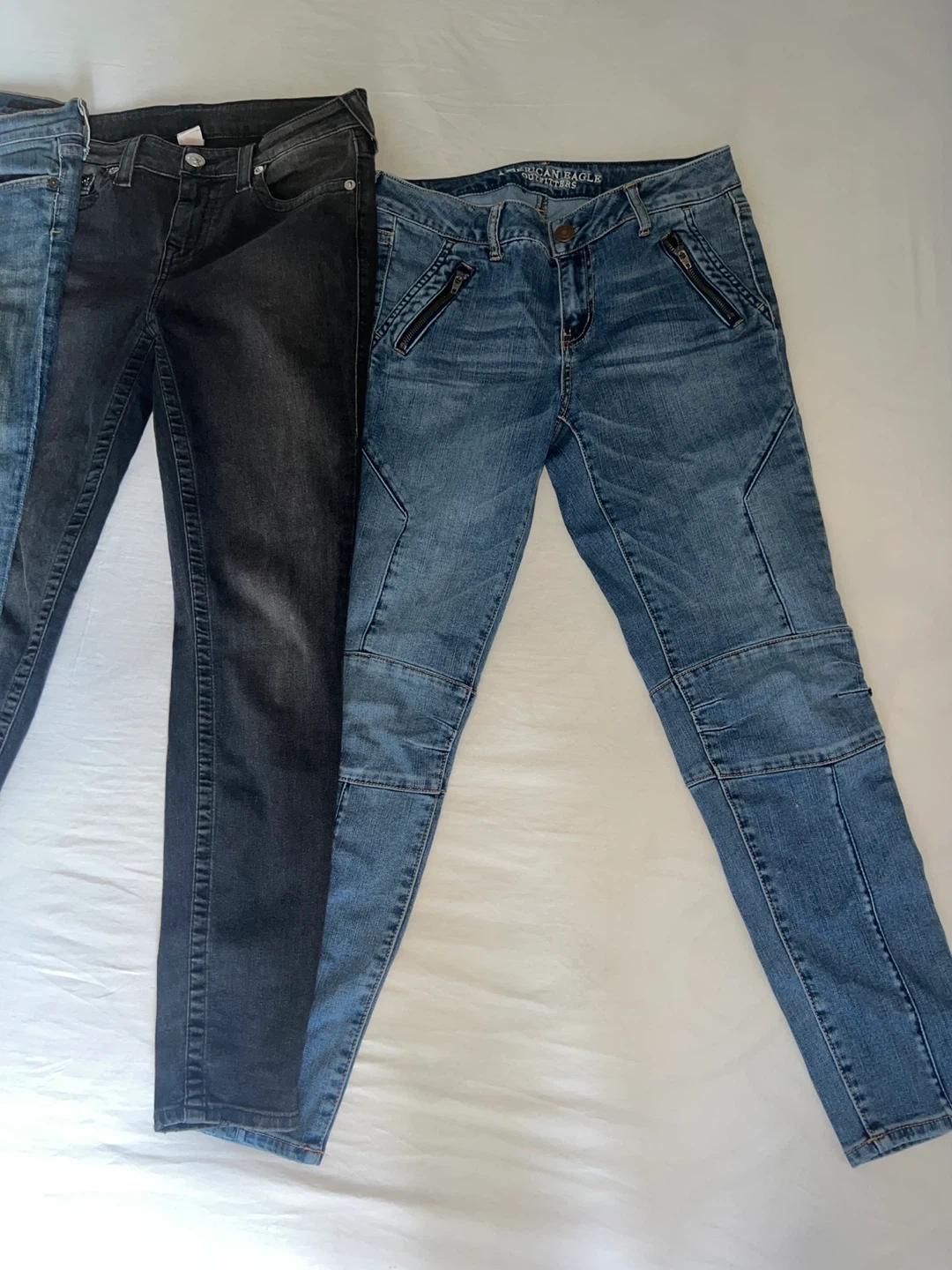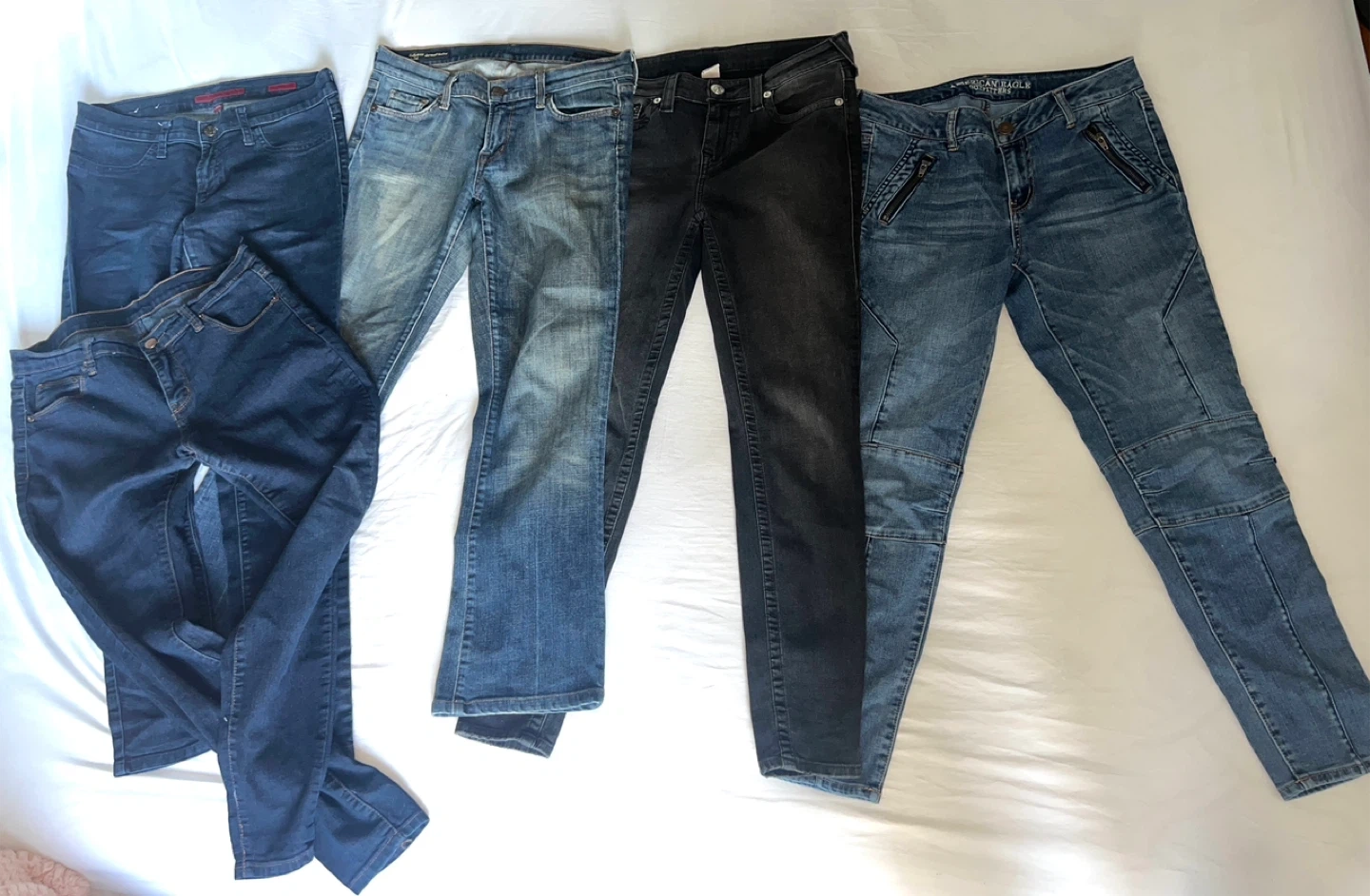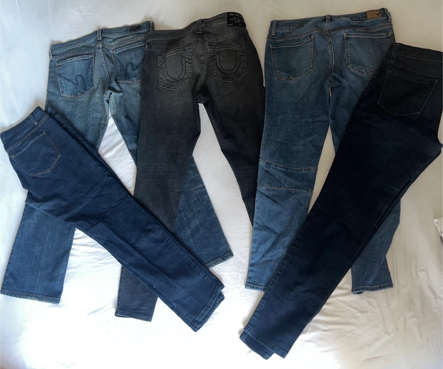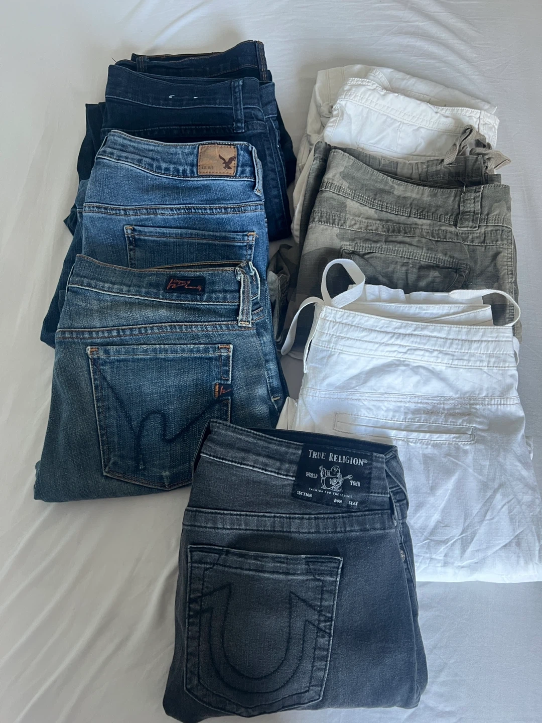 • 6 pairs of jeans — mix of skinny, boot cut, and cargo styles. Notable brands include: