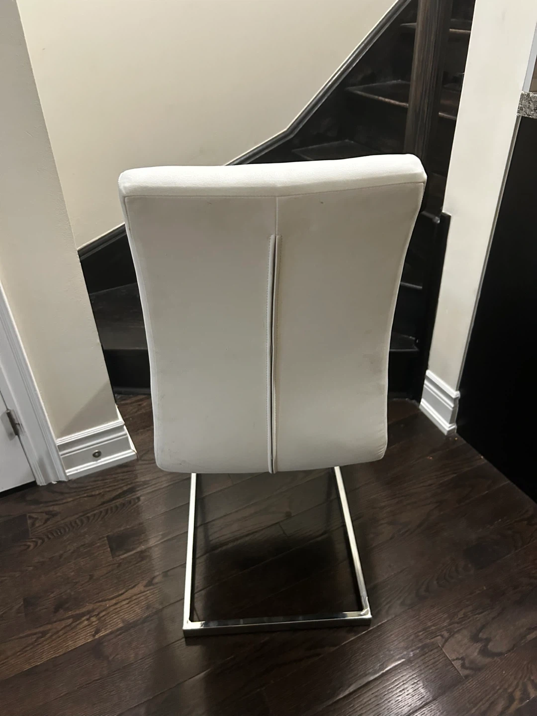 Selling a set of 4 modern dining chairs! They feature a sleek, white faux leather seat and back with a chrome-finished metal base. These chairs are perfect for adding a touch of contemporary style to your dining space. The quilted design on the seat and back adds a comfortable and stylish touch
