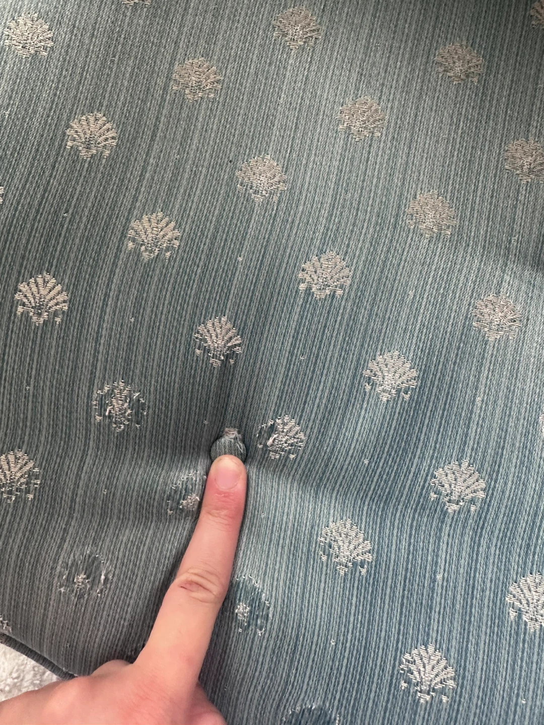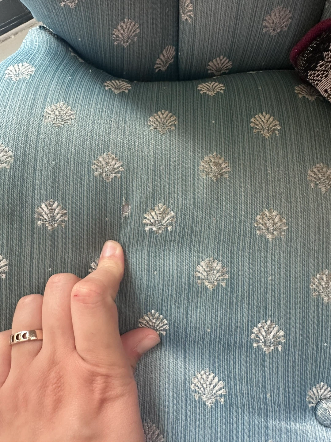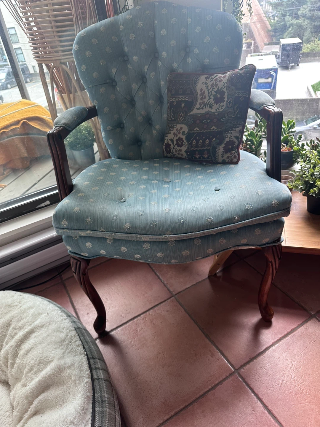 Selling a lovely vintage armchair with a unique blue patterned fabric! It's got a classic look that would add a touch of charm to any room. There are a couple of flaws in the fabric as pictured, but it's still a very sturdy and comfortable chair