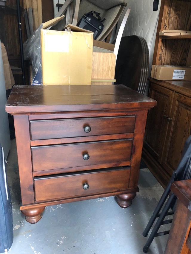 This used wood nightstand features a rich, dark finish and three spacious drawers, perfect for bedside storage. Please note, it has some visible wear and tear on the top surface, as shown in the photos. Despite being pre-loved, it's structurally sound and ready to serve!