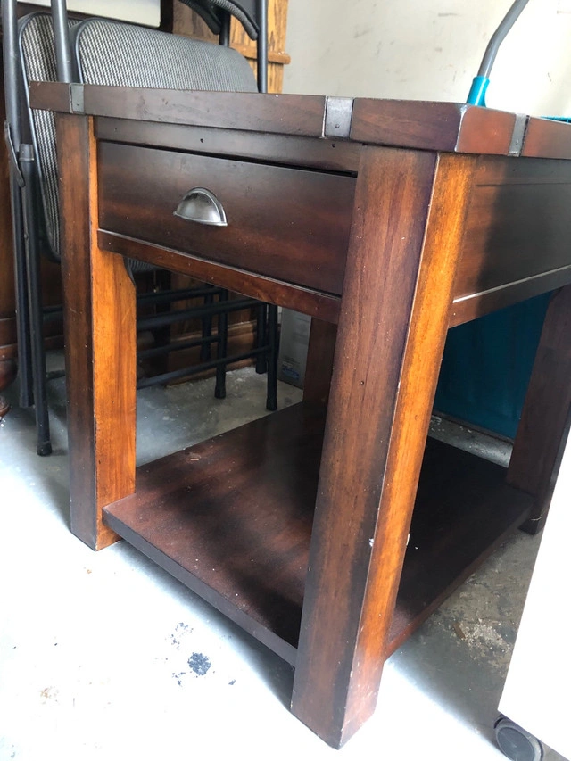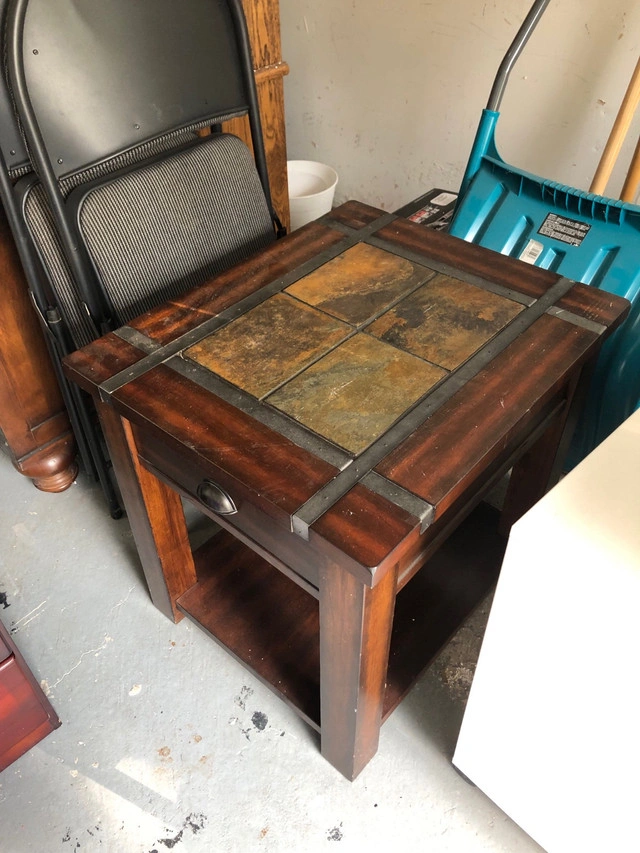 This used end table features a beautiful slate tile inlay on top and a convenient drawer for storage. It has a sturdy shelf at the bottom for added functionality. The dark wood finish complements any decor. Here are the specs: * Durable construction * Slate tile inlay * Bottom shelf * One drawer If the ad is up, it's available!