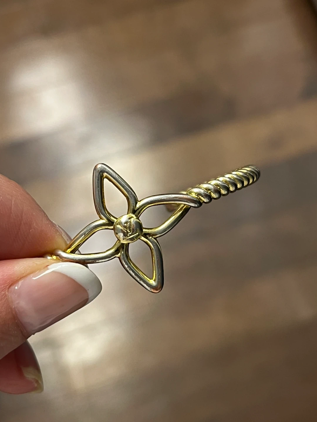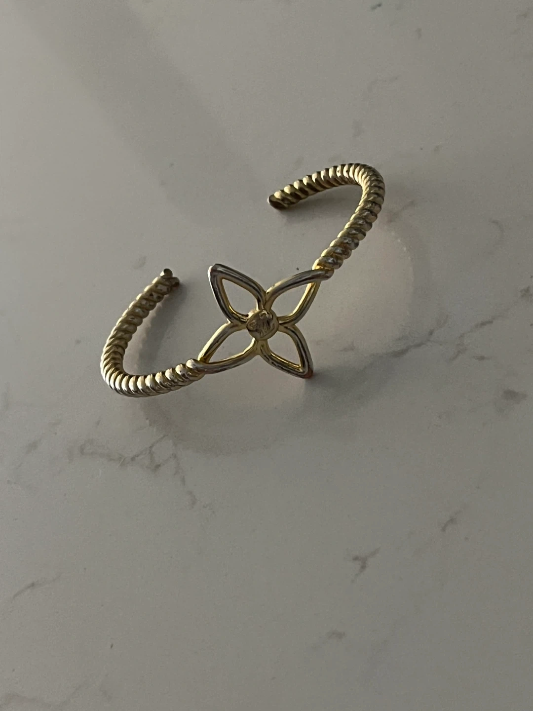 This gold tone cuff bracelet features a lovely flower accent at its centre. It's designed with a twisted band for added detail.
