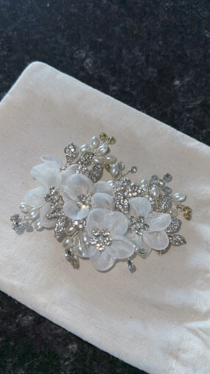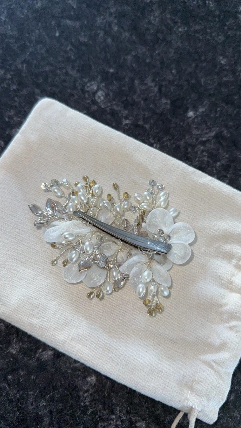 Selling a beautiful white floral hair clip. It features delicate white flowers, pearls, and sparkling rhinestones. It's in great condition and would be perfect for a wedding or special occasion!