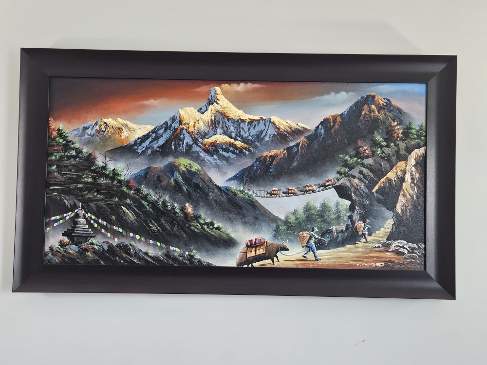Selling a framed painting featuring a mountain landscape scene from Nepal. Hand painted (oil). It's a great piece to add some character to your home!