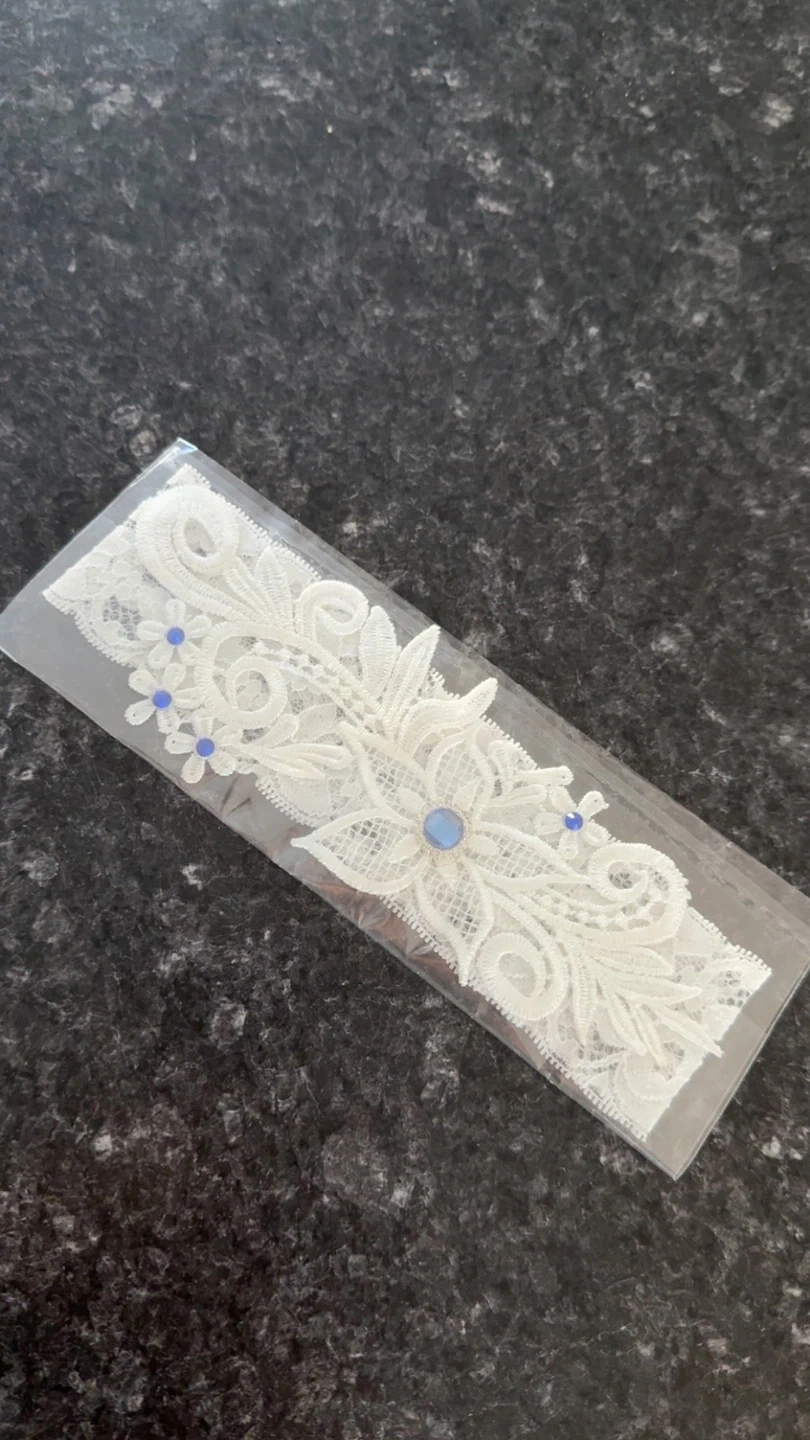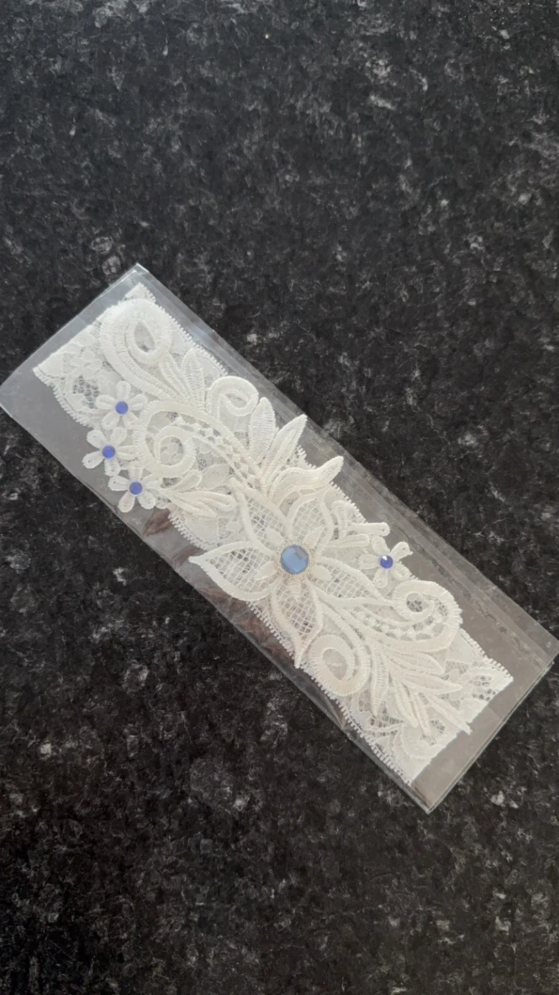 Selling a brand new, white floral lace garter. It's still in its original packaging and features delicate floral designs with small blue accents. Perfect for a wedding!