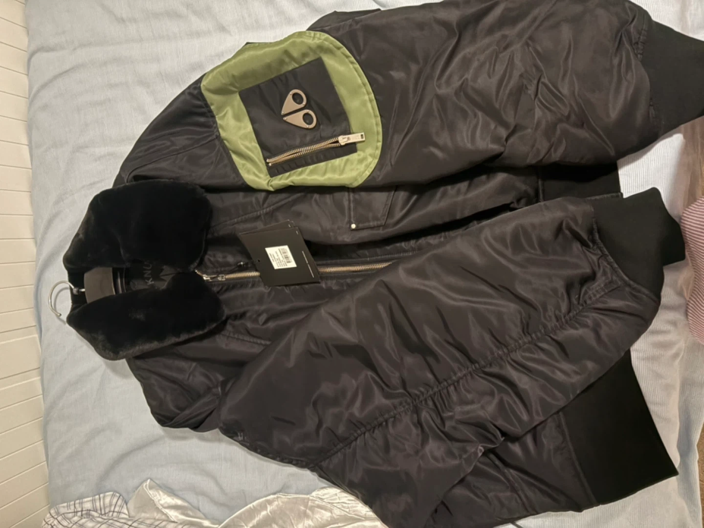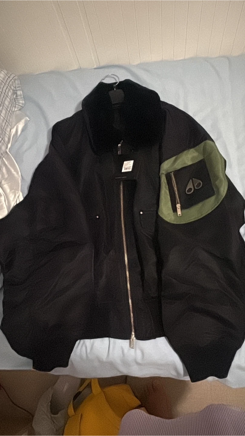 Selling a Moose Knuckles bomber jacket in black. It features a fur collar and a unique pocket design on the sleeve. Perfect for staying warm and stylish during the colder months!