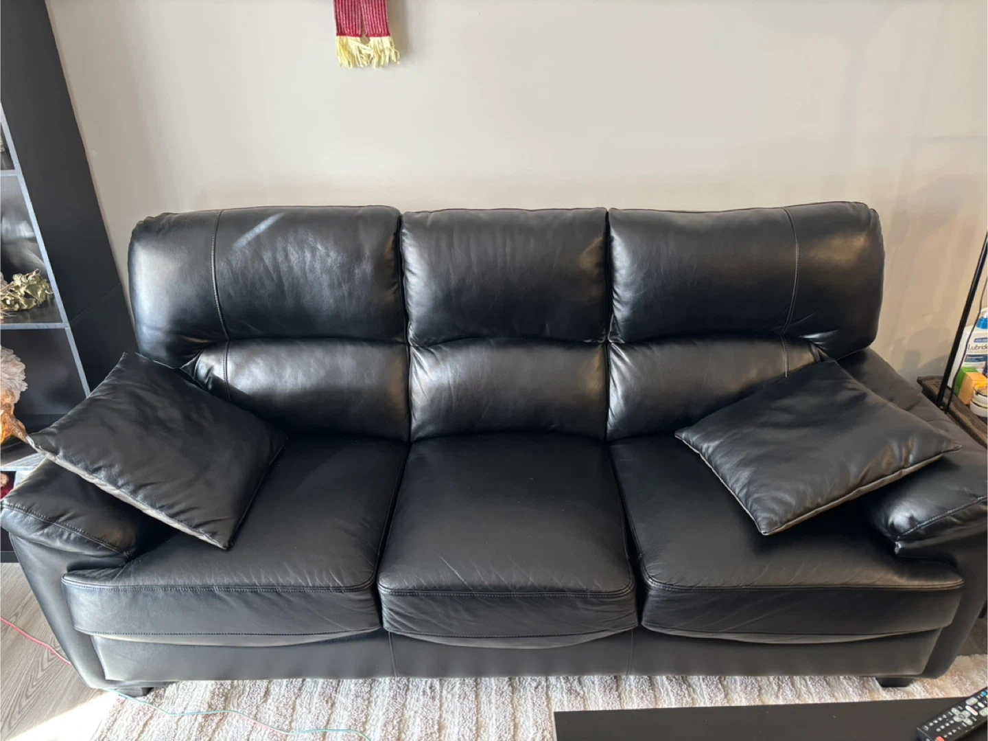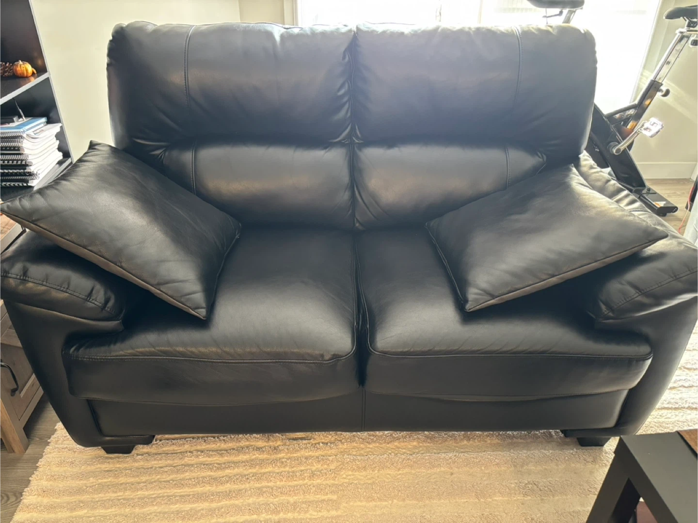 65Selling a 2 comfortable black leather sofas. Both in great condition and ready for a new home! Perfect for a living room or den, this sofas offers both style and relaxation. It's a great addition to any space! Easy to move, back seat possible to take off!!! 4 pillows coming as well. No any damage. Pet&Smoke Free. Pick up on Fridays or Saturdays from 10am to 5pm!!! I need to book elevator, please contact day before!!! Pick up!!! Cash only!!!