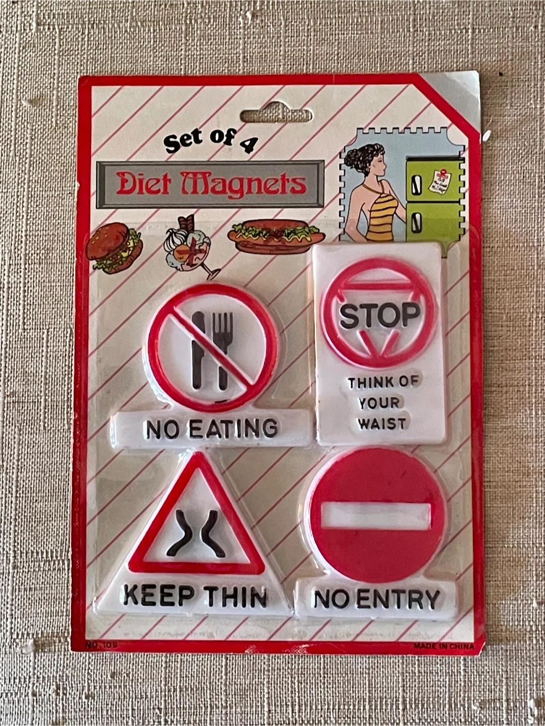 174Selling a set of 4 diet magnets. They feature fun designs with messages like 'No Eating,' 'Keep Thin,' and 'Stop Think of Your Waist' to help you stay on track. Perfect for adding a touch of humour to your fridge while keeping your goals in mind. Brand new in package.