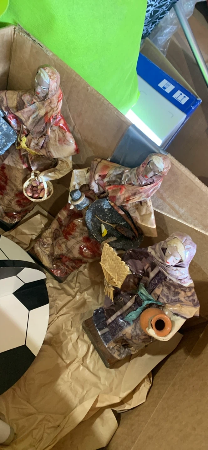 25A collection of figurines in a box. They appear to be handmade or vintage. Perfect for collectors or those looking for unique decorative items