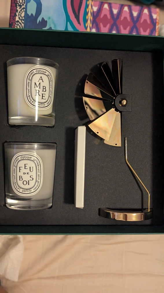 Selling a Diptyque candle set that includes their holiday carousel and Ambre and Feu De Bois candles. It also comes with the box and other components, completely new, never taken out of box.