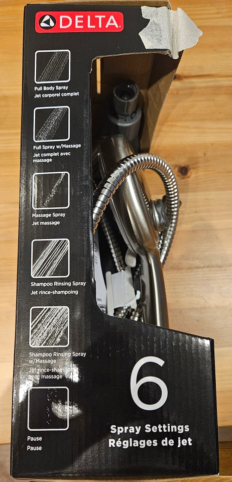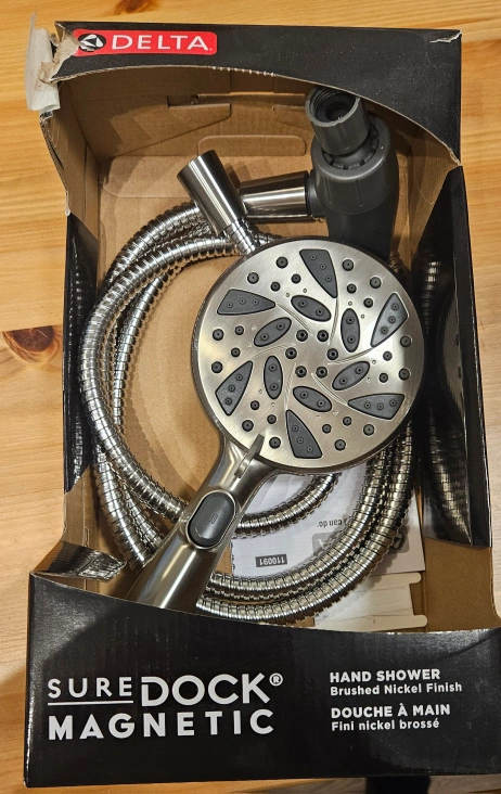 Selling a Delta SureDock Magnetic hand shower in brushed nickel! It's in great condition and comes with the original box.