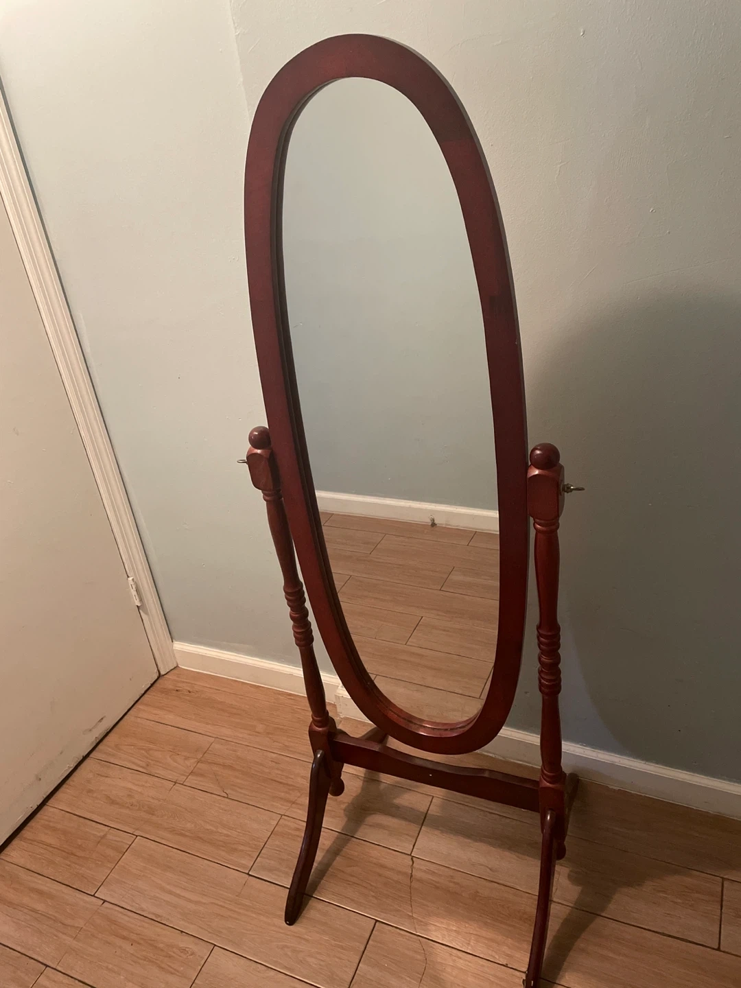 This is a dark wood cheval mirror with an oval shape. It's in good condition and would look great in any room! The mirror is supported by a stand, making it easy to move around