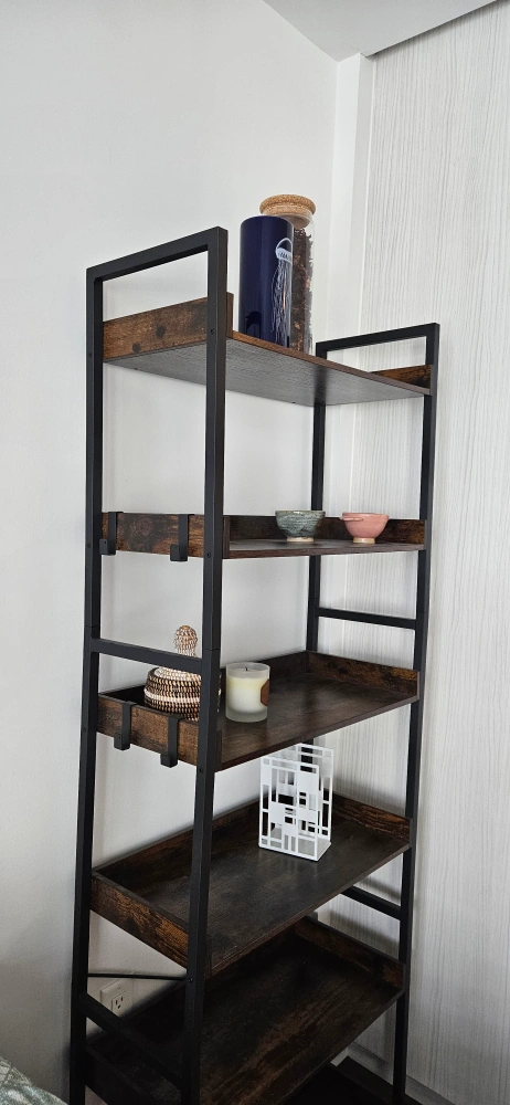 Rolanstar Bookshelf. This is a stylish 5-tier bookshelf in a rustic brown and black finish. Great for books, plants, or decorative items! it comes with 4 hangers you can put on the side. Like new, 2 years of use only.