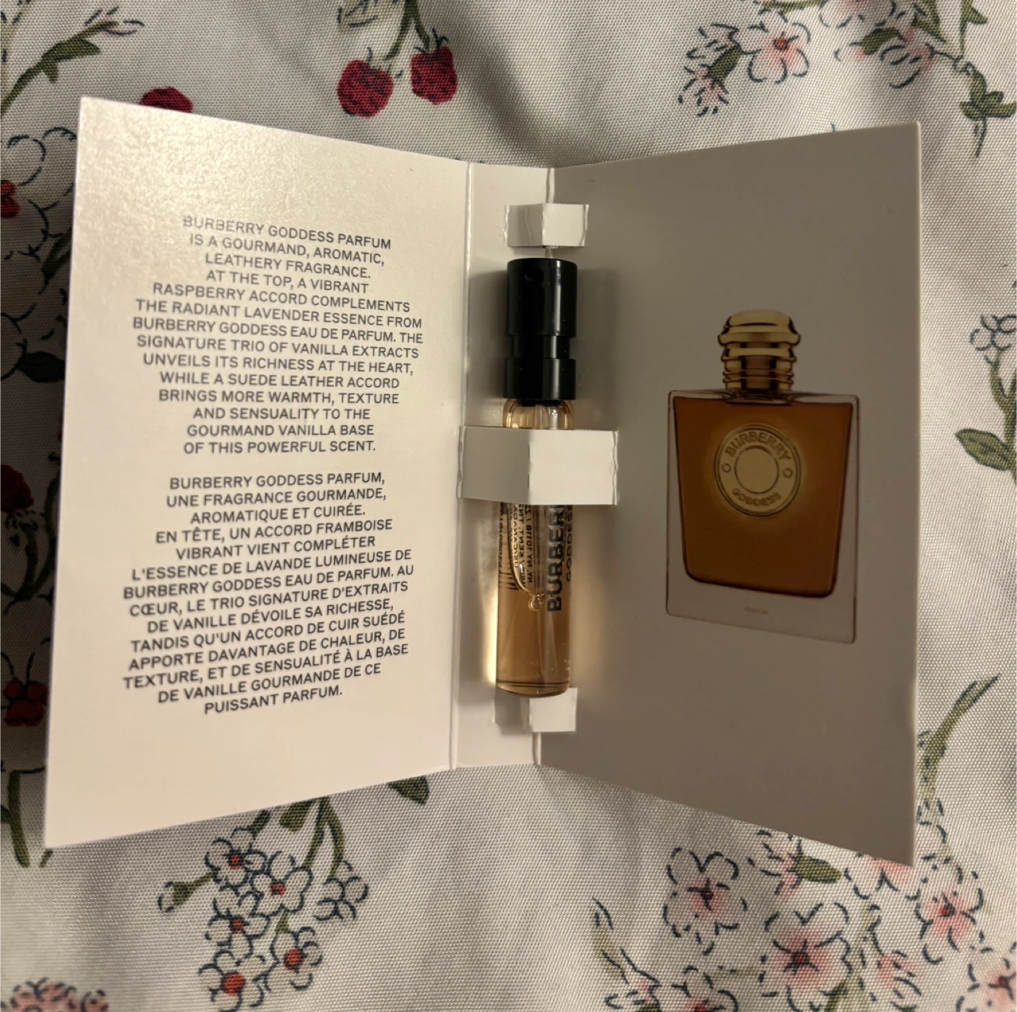 Selling a Burberry Goddess Parfum sample. It's a 1.5ml natural spray vaporisateur. The fragrance is a gourmand, aromatic, leathery fragrance. Perfect to try out the scent!