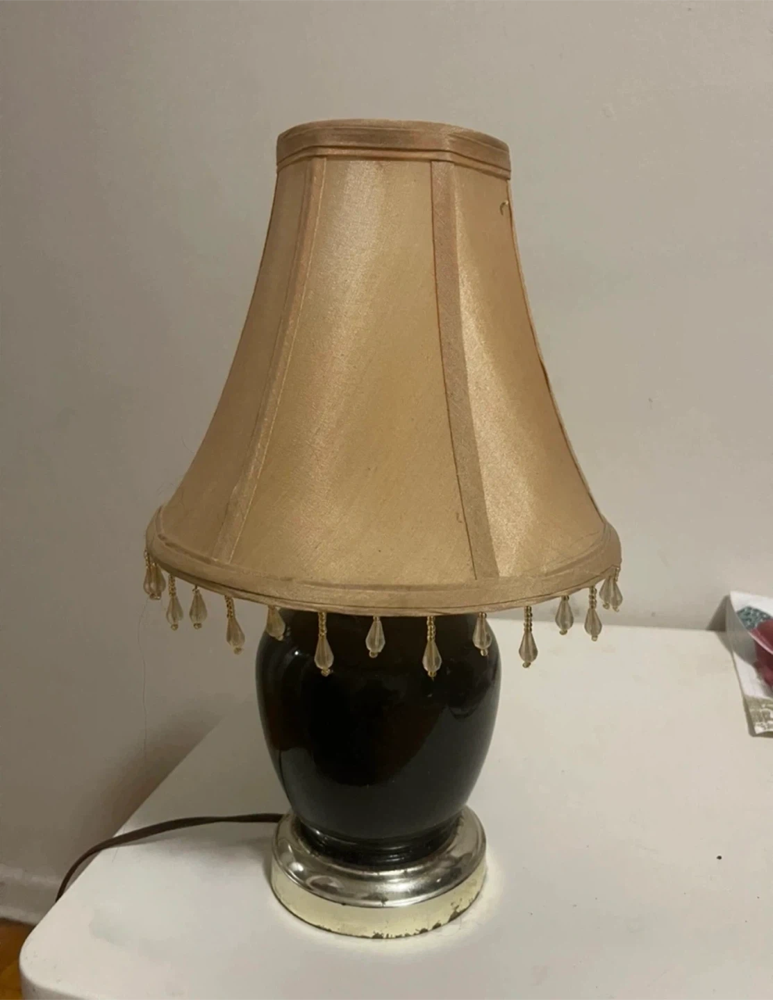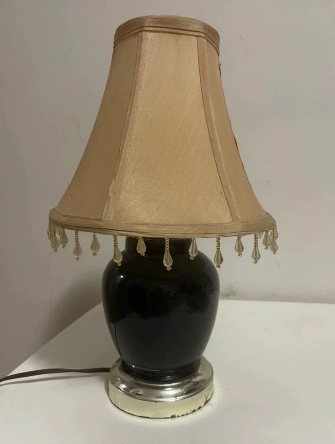 Selling a table lamp with a beige shade. It has a classic look with a black base and silver accents. The shade is a soft beige colour and has decorative beads around the edge. It would look great in a bedroom or living room