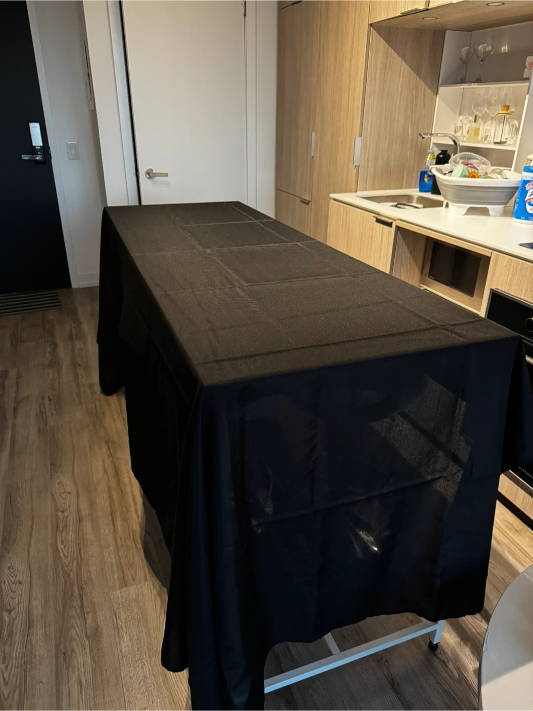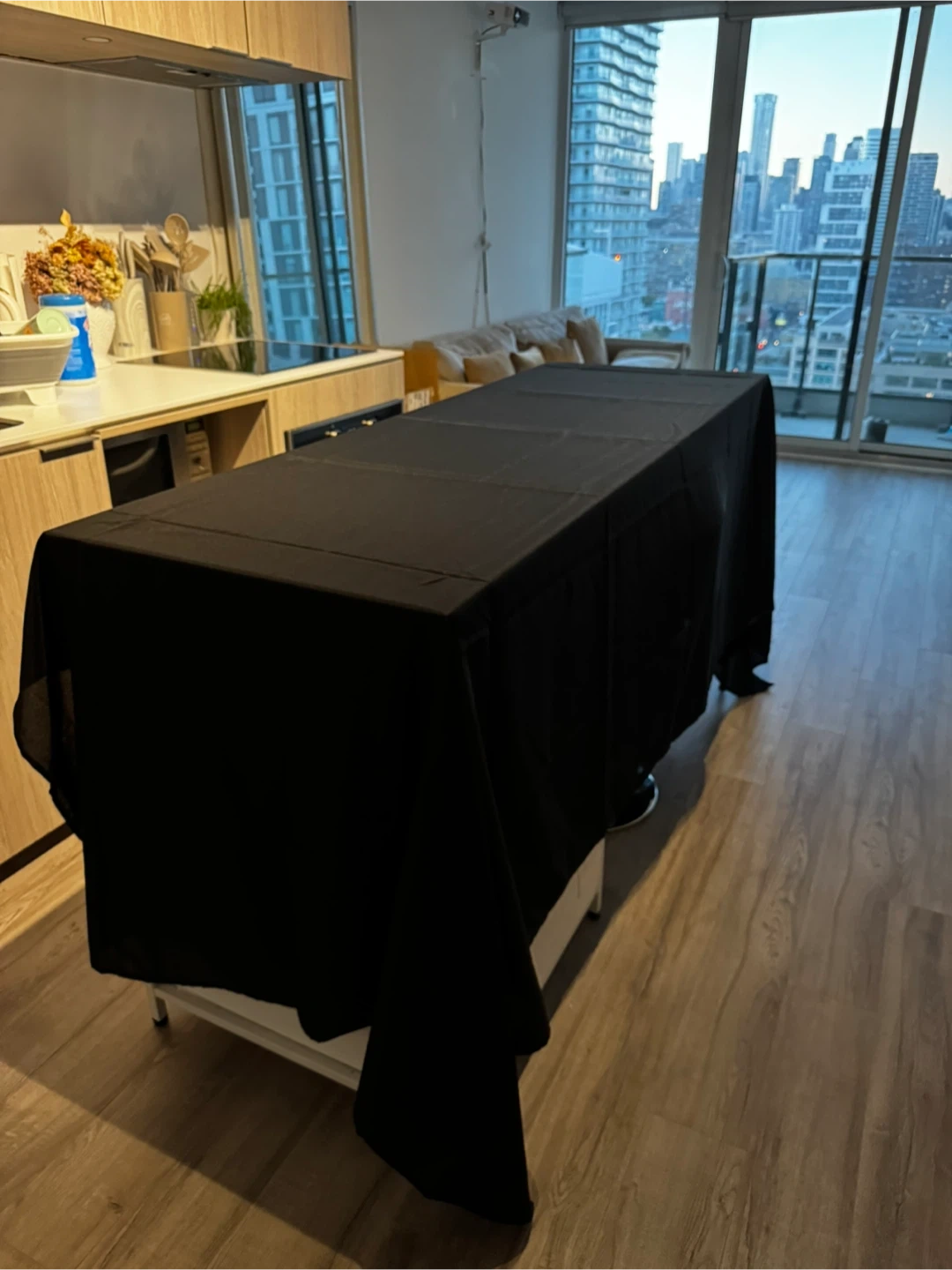 Selling a black tablecloth, perfect for adding a touch of elegance to your dining space! It's made of 100% polyester and measures 60"x126"